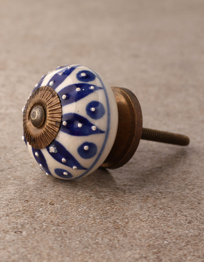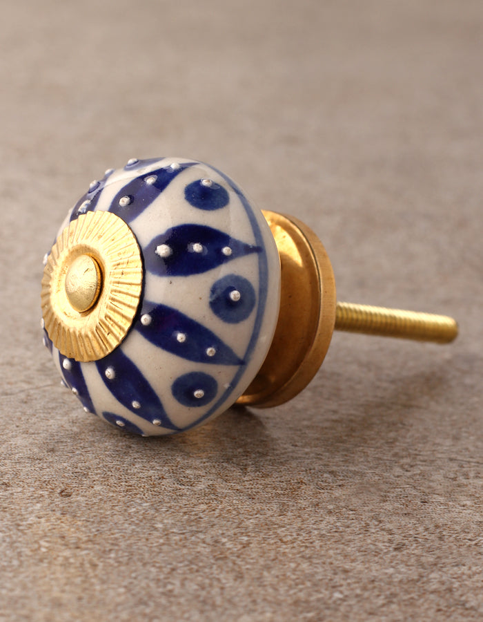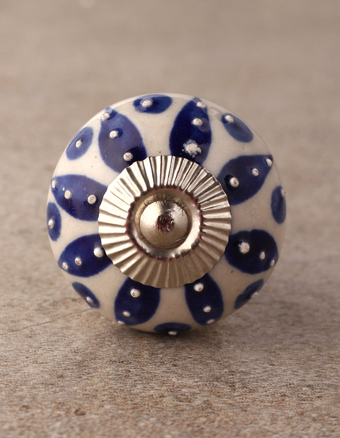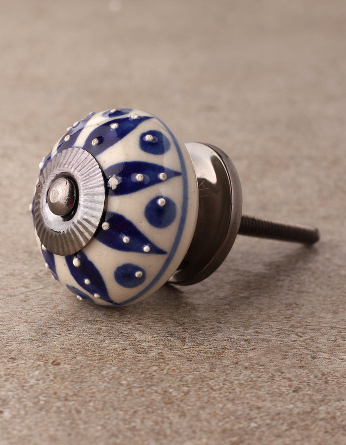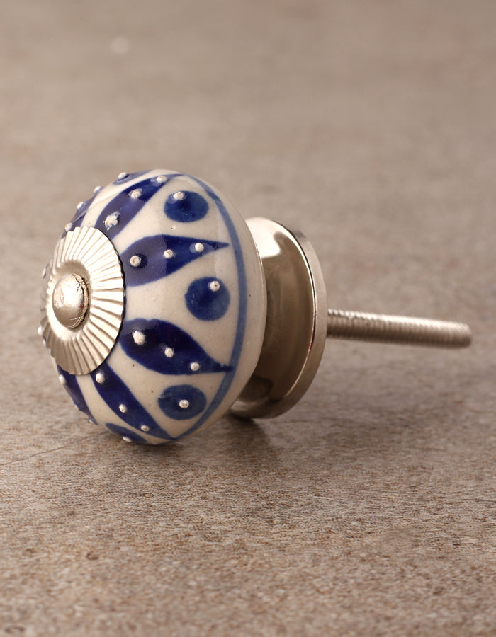Stylish Cream Ceramic Door Knob With Blue Designer Print
