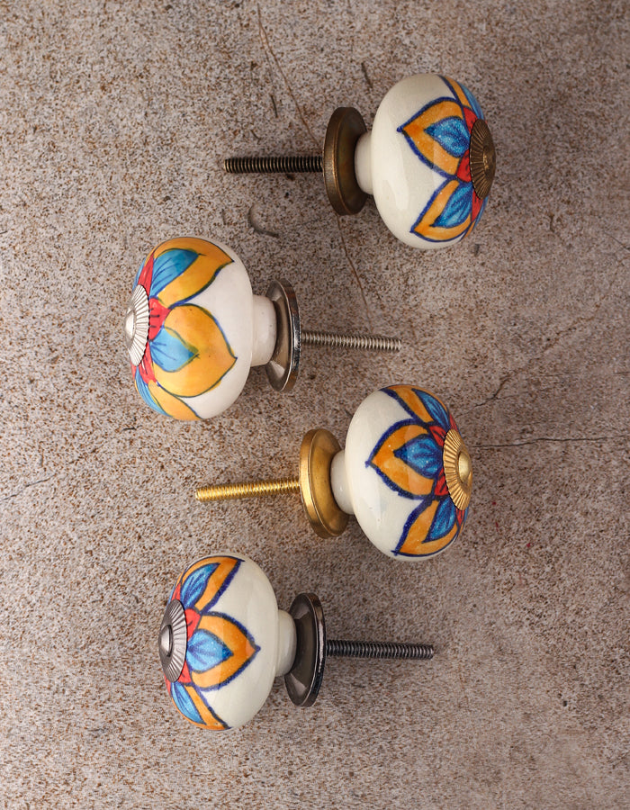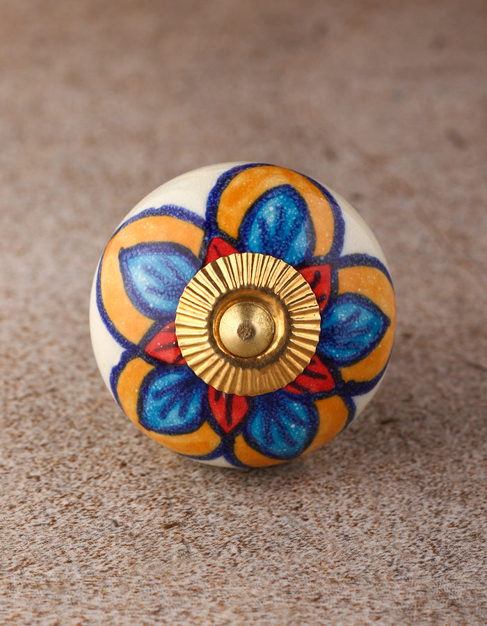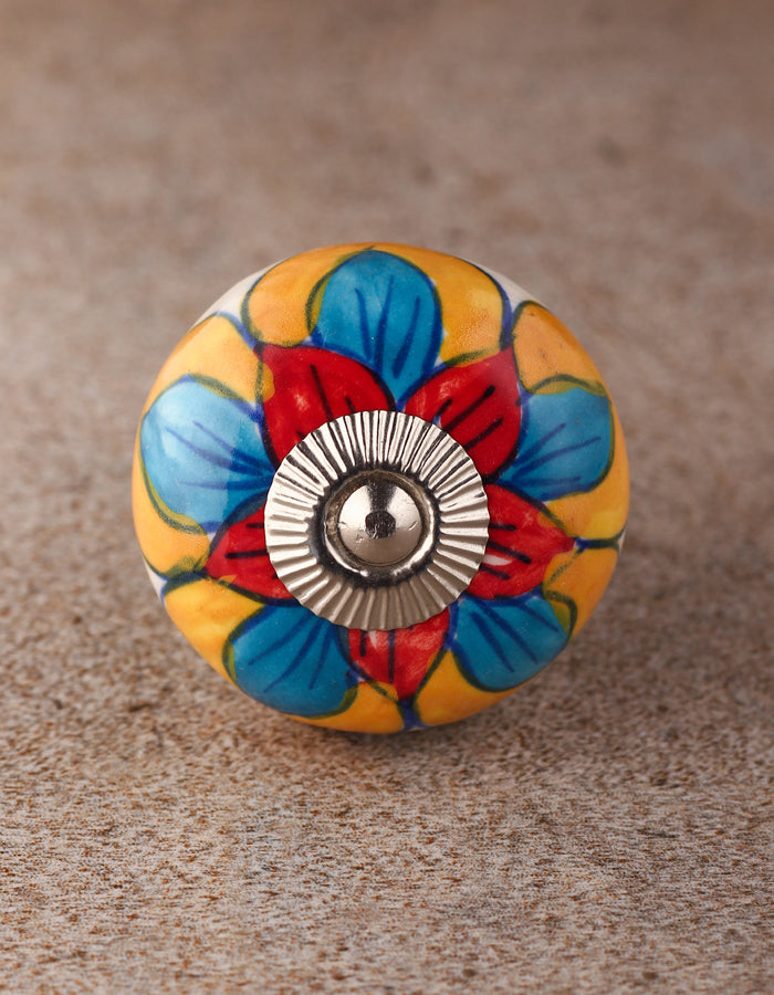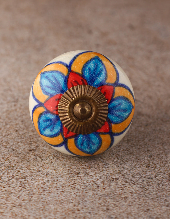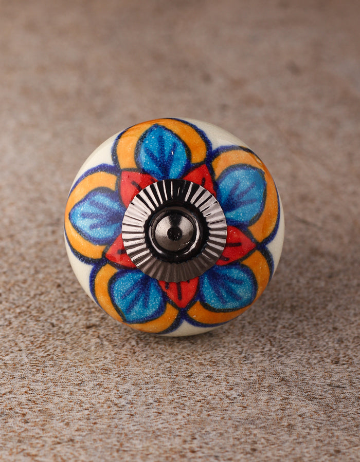 Stylish White Cabinet Knob With Red, Turquoise And Yellow Colored Flower