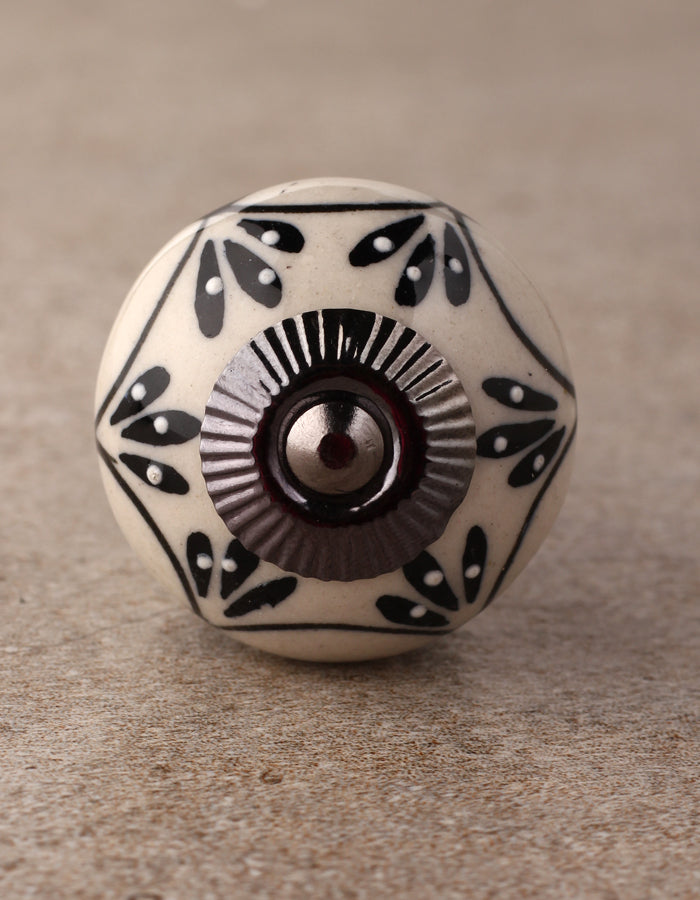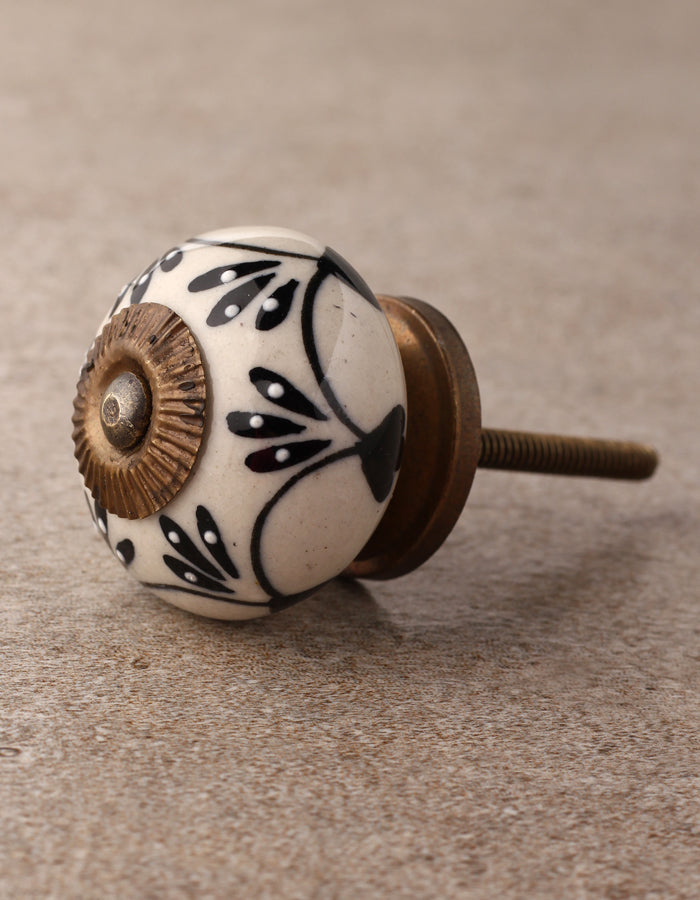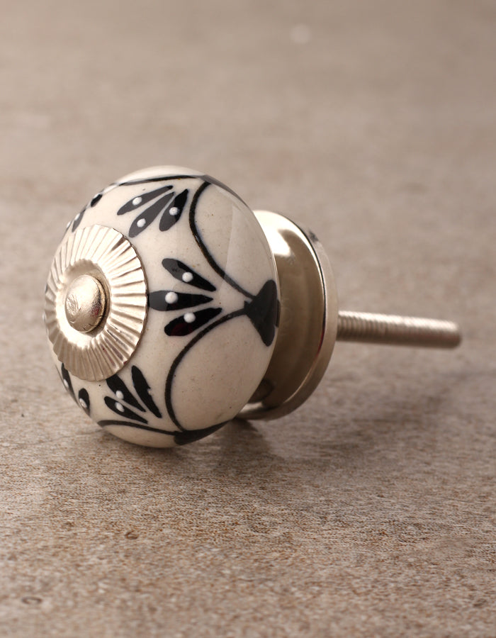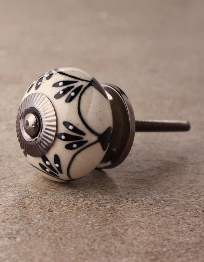 Stylish White Ceramic Knob with Black Embossed Floral Print