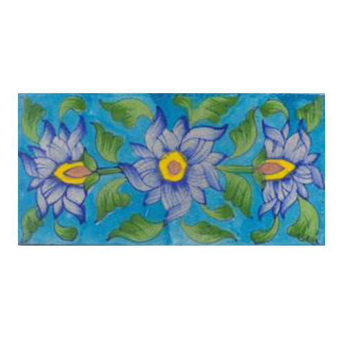 Three blue,yellow,brown and lime green leaves with turqouise tile