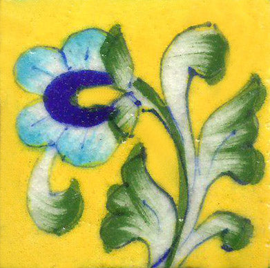 Turquoise and Blue Flower With Green Leave On Yellow Base Tile