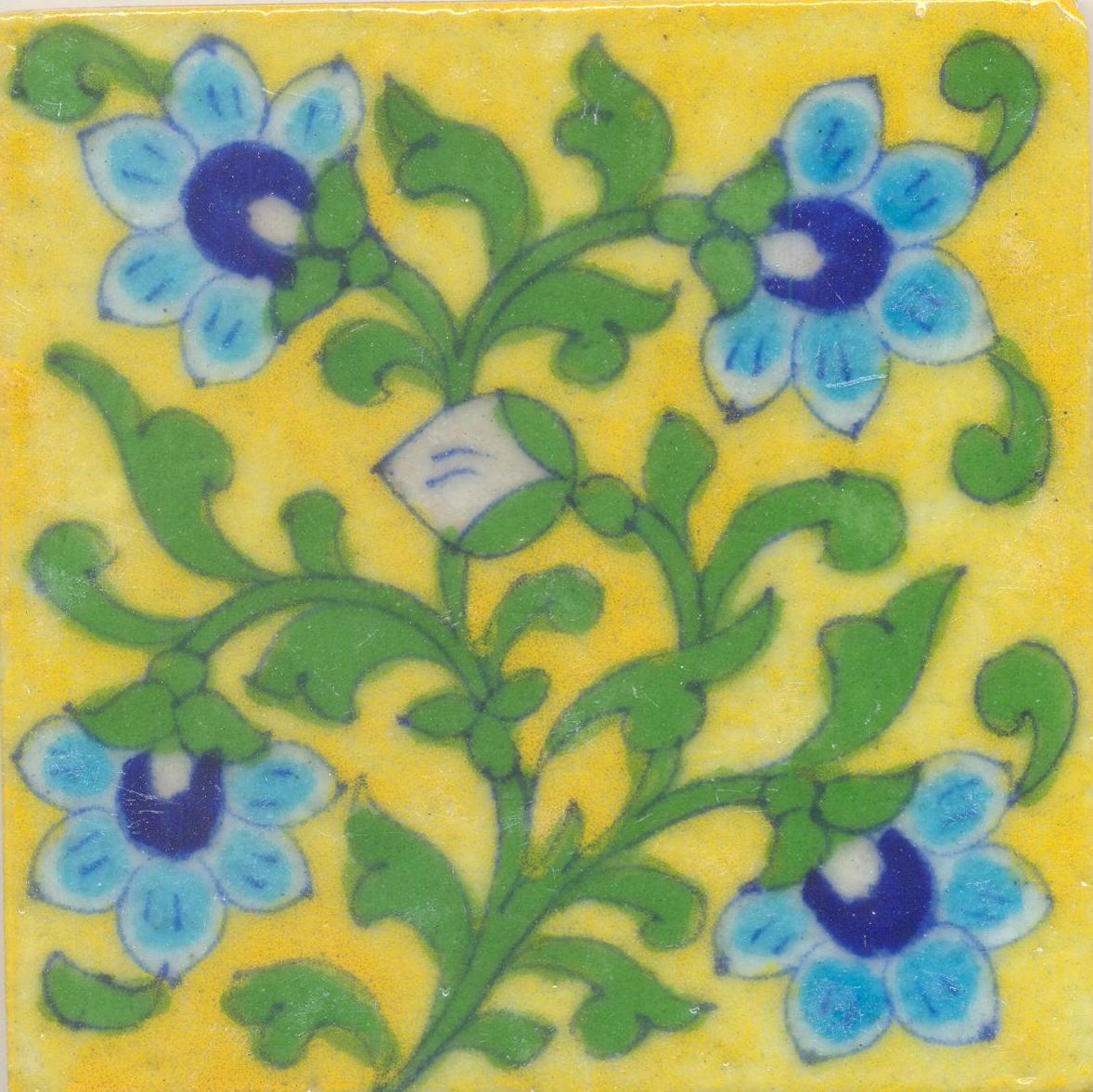 Turquoise and Blue Flowers and Green leaf with Yellow base Tile