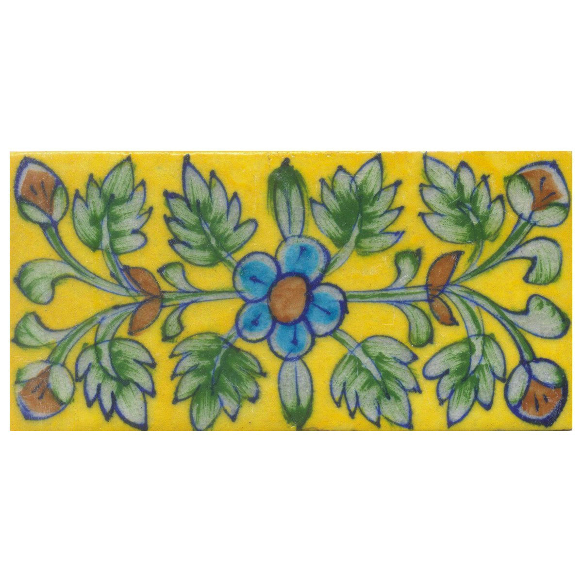 Turquoise and Brown Flower and Lime Green leaf with Yellow Base Tile