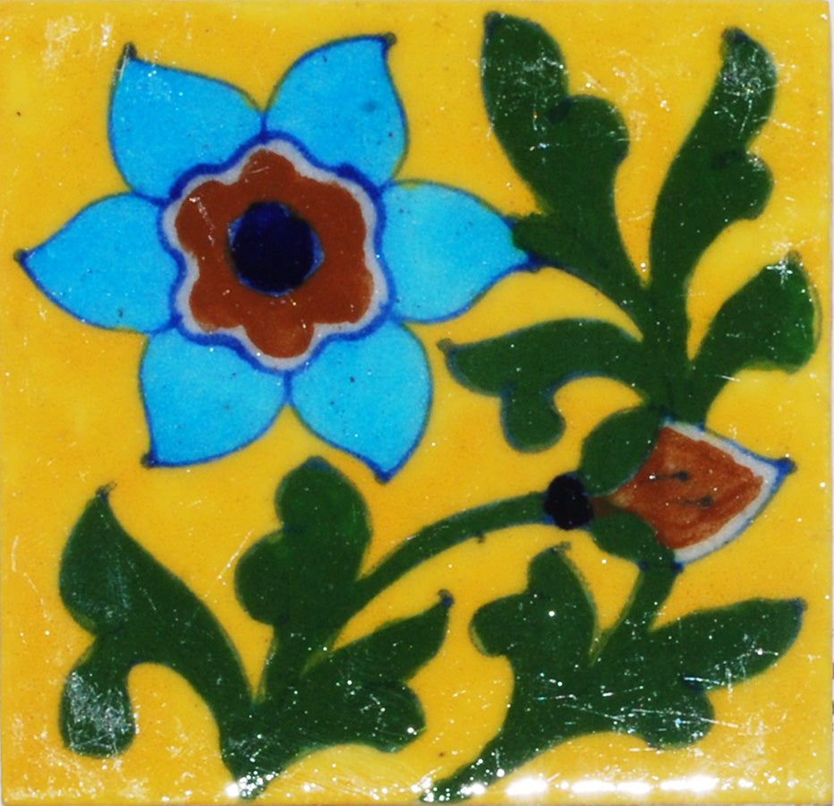 Turquoise and Brown flower with Green leaves on yellow base.(3x3)