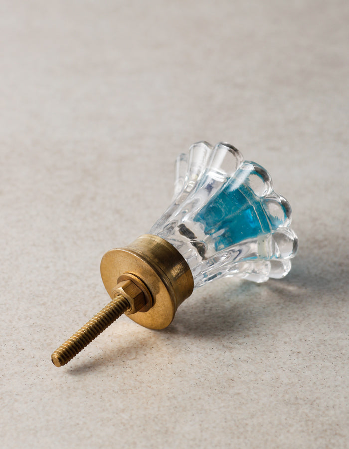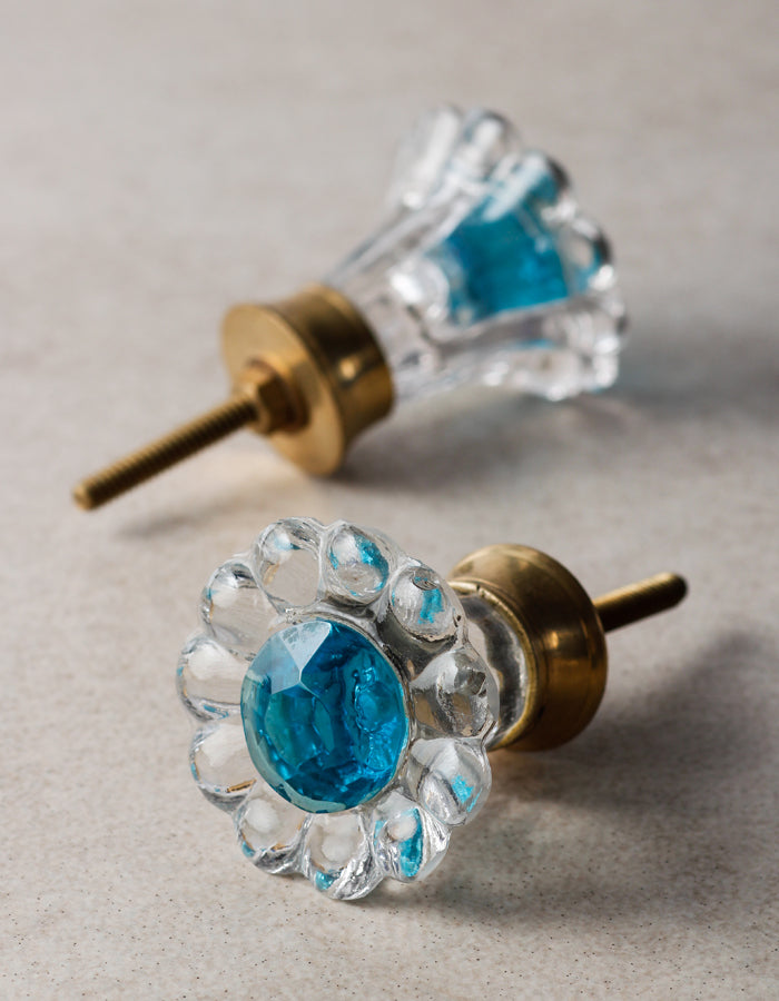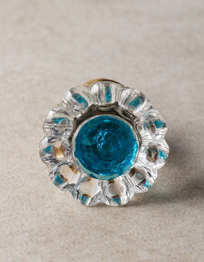 Turquoise And Transparent Daisy Flower Glass Cabinet Knob will surely add color and style to any corner of your home. The beautiful glass petals of the knob centered bt diamond cut glass makes it the perfect choice for your home.
