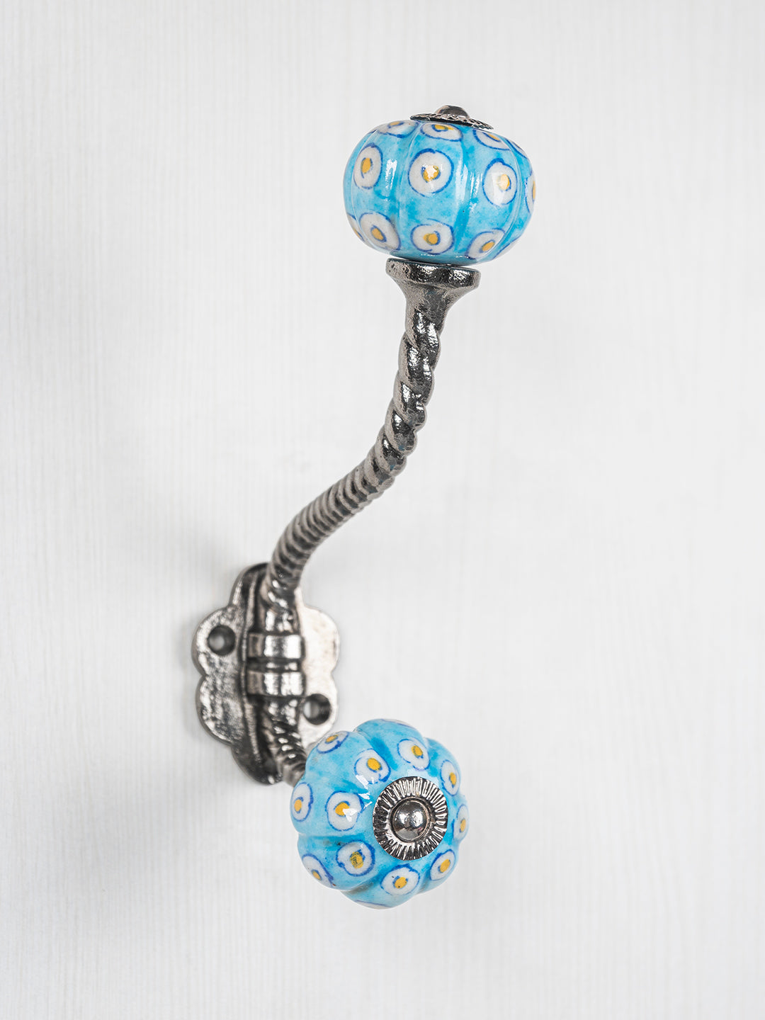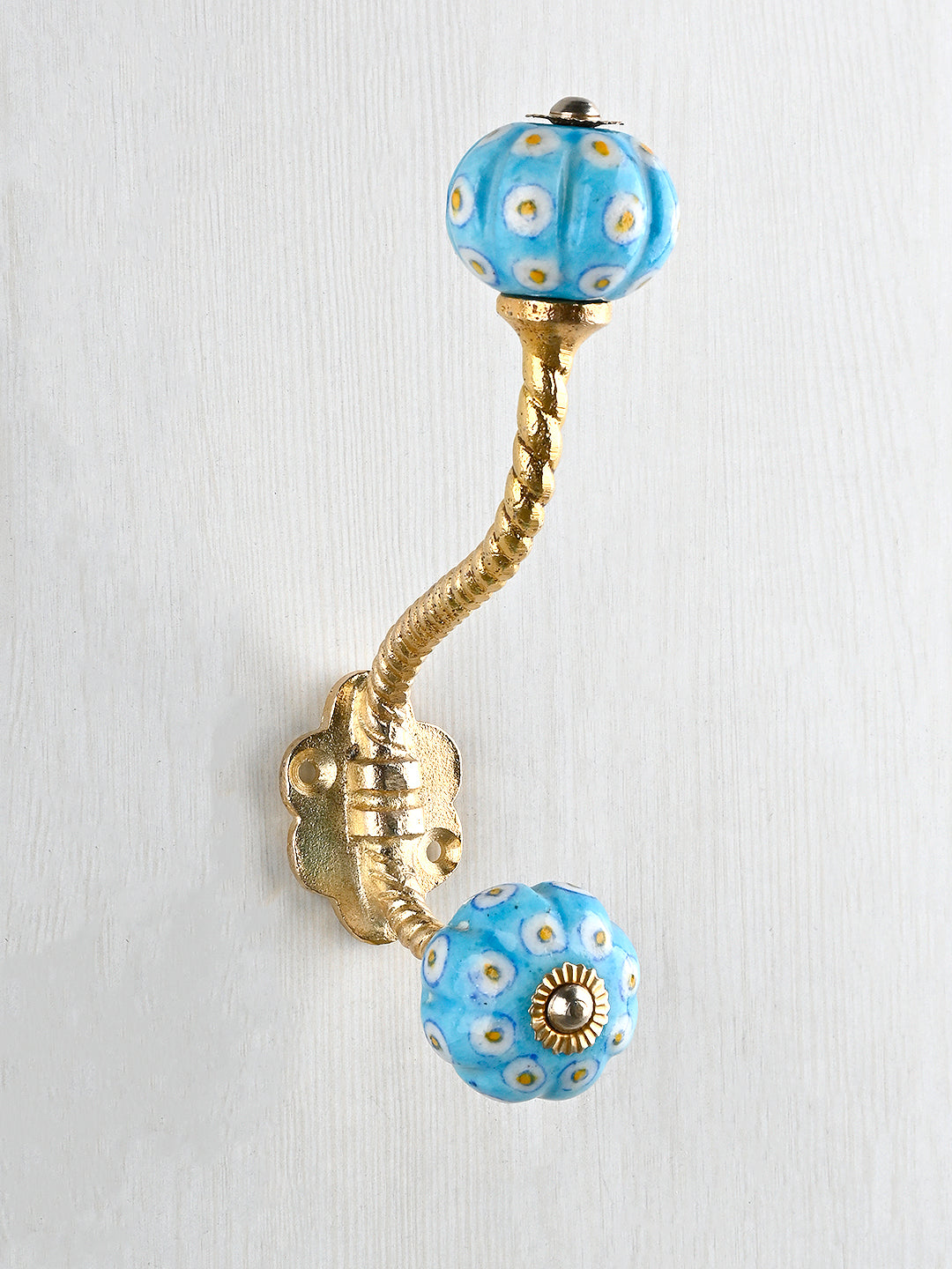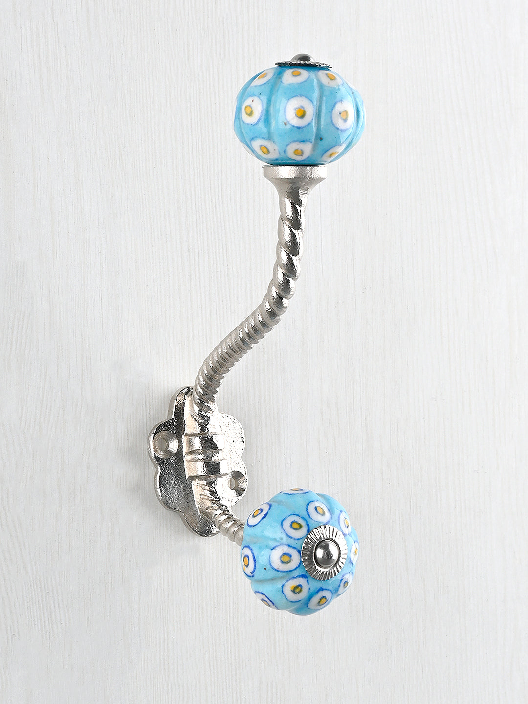 Turquoise and Yellow dots Ceramic Knob With Metal Wall Hanger