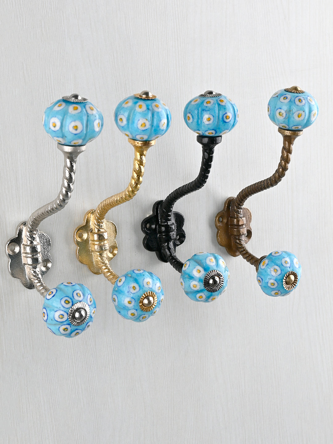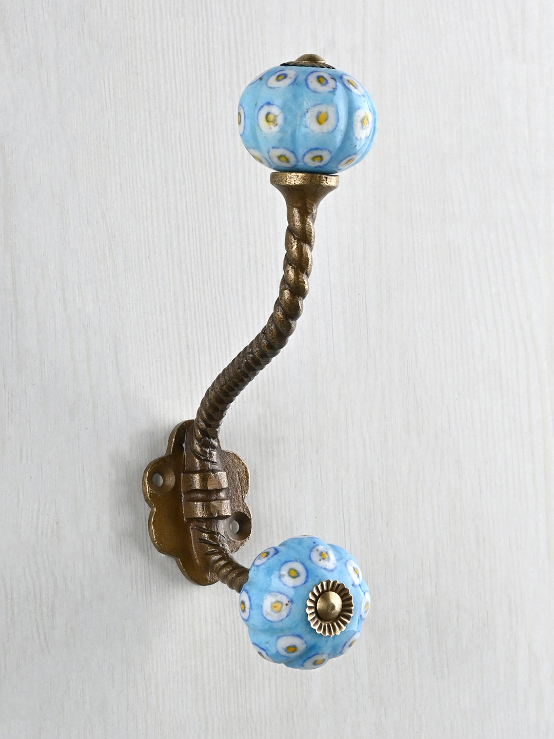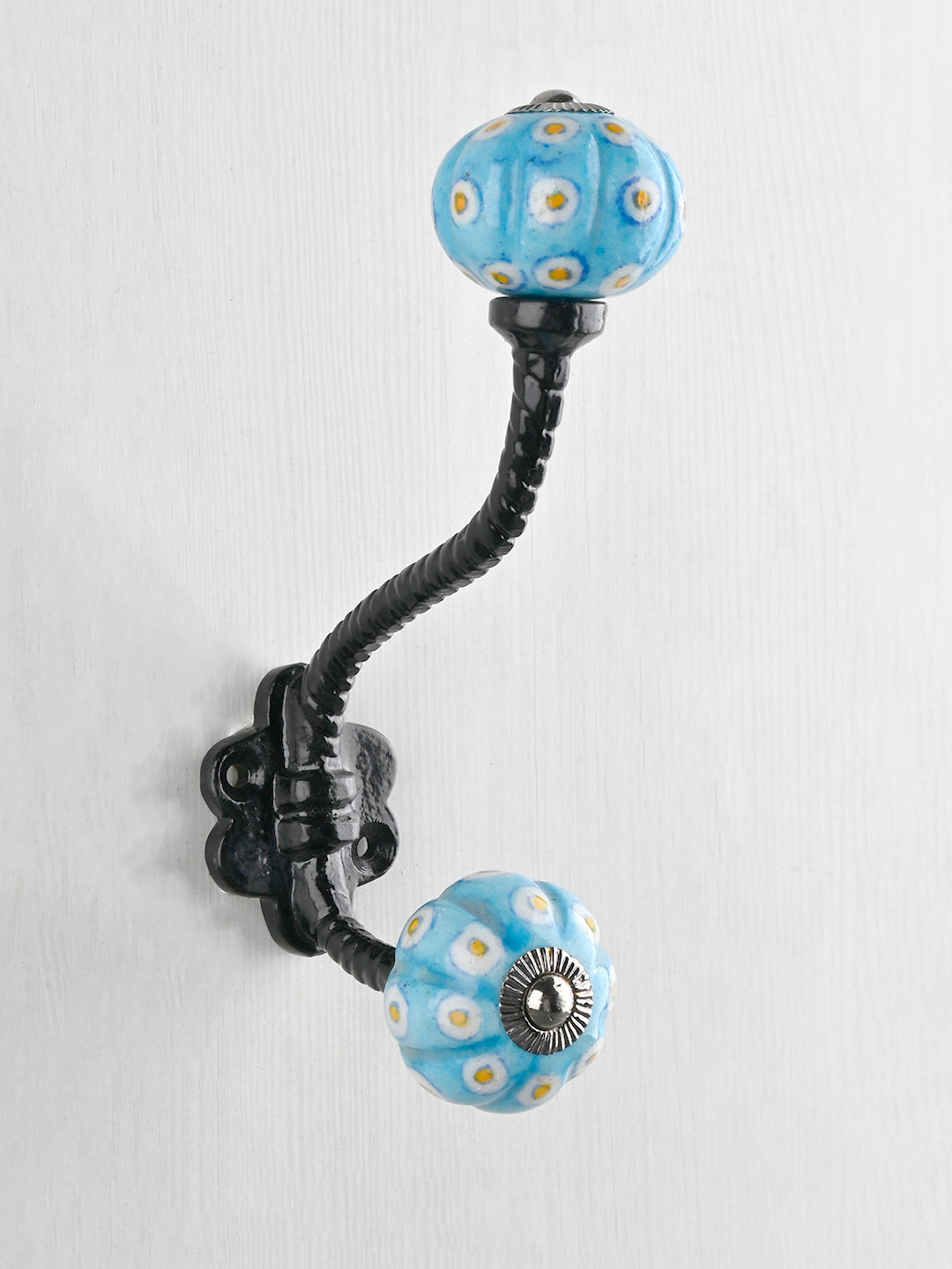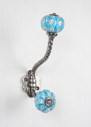 Turquoise and Yellow dots Ceramic Knob With Metal Wall Hanger