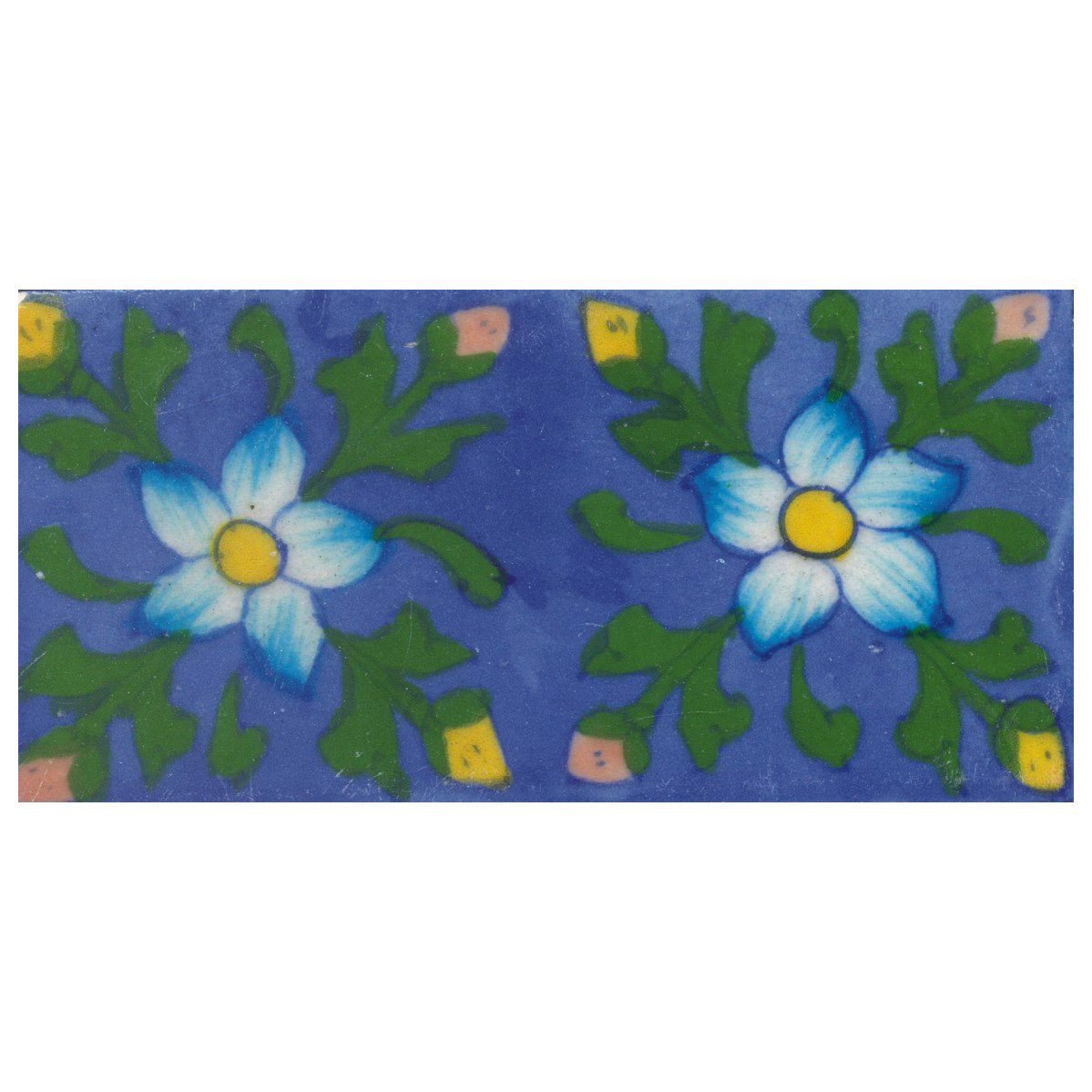 Turquoise and Yellow Flowers and Green leaf with Blue Base Tile
