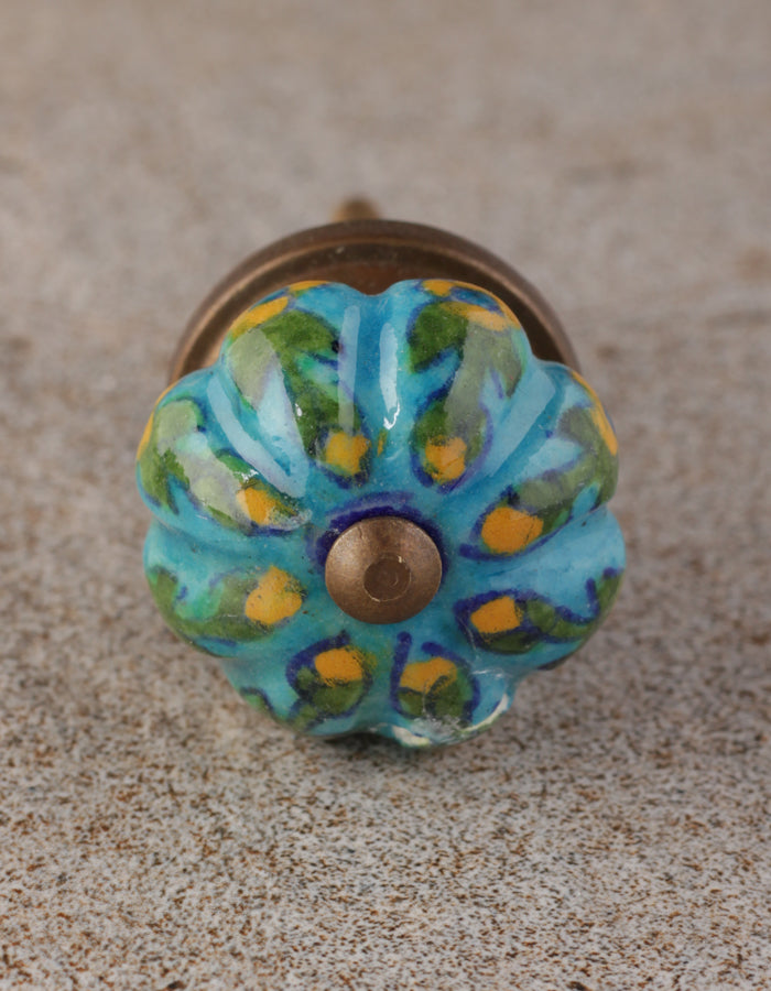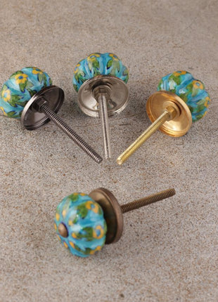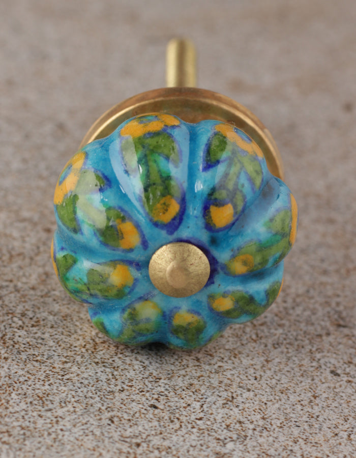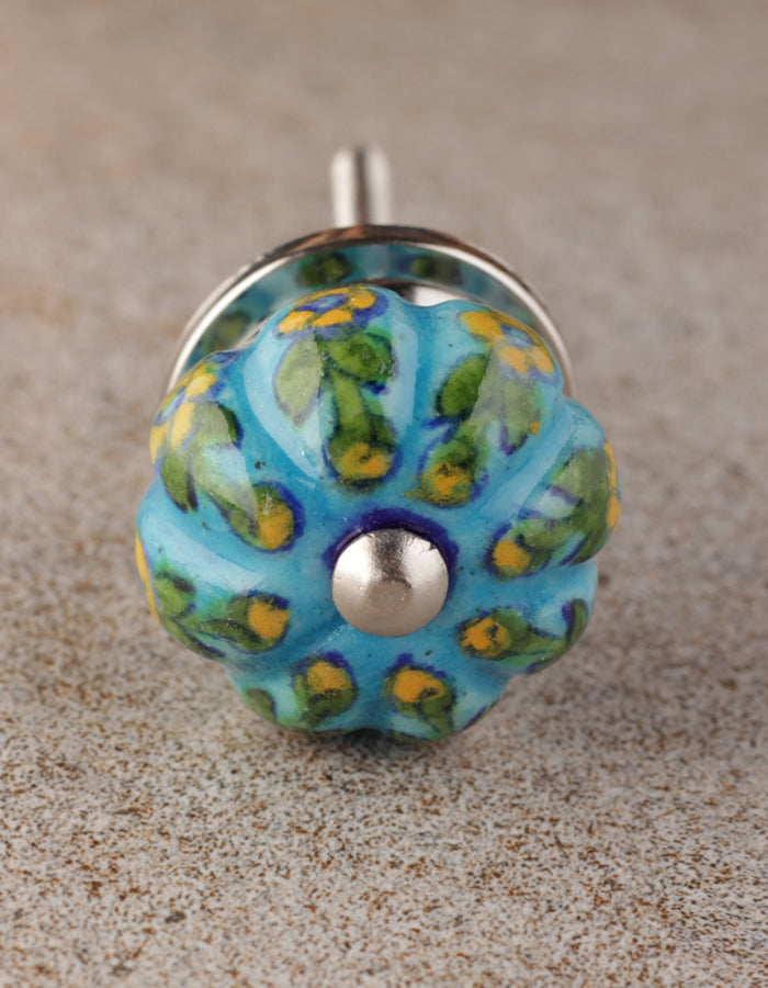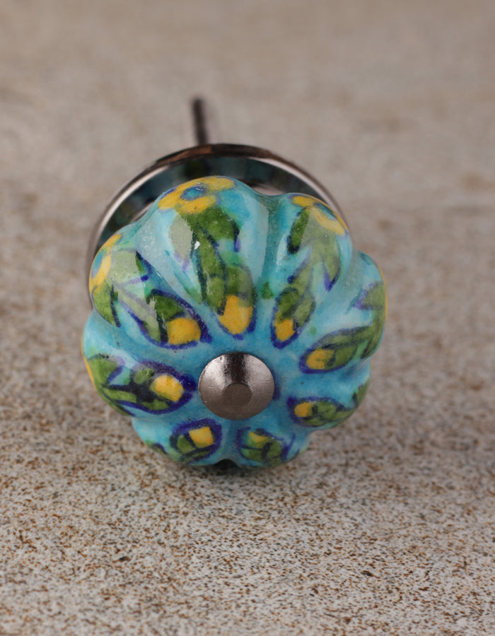Turquoise Base Ceramic Bathroom Cabinet Knob With Yellow Flowers