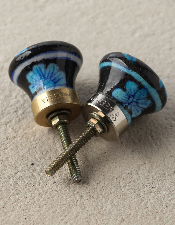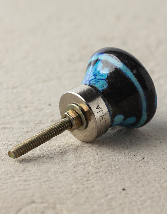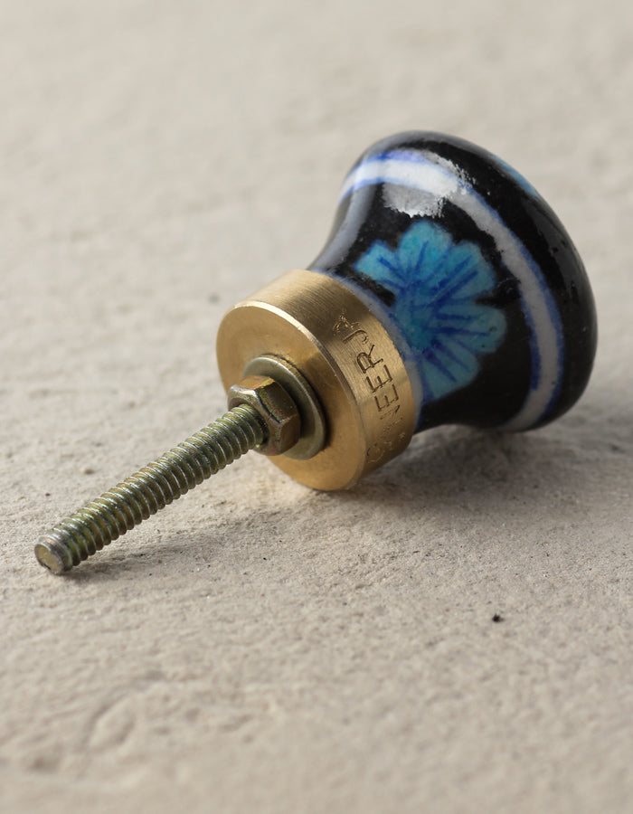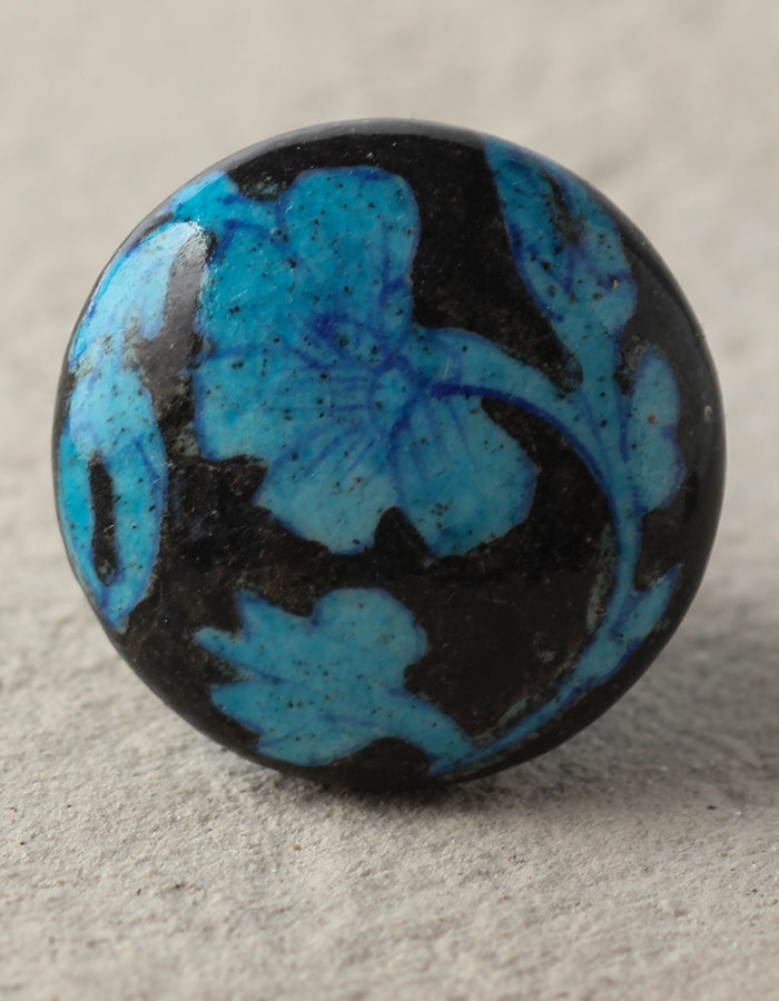Turquoise Flower On Black Ceramic Blue Pottery Dresser Cabinet Knob