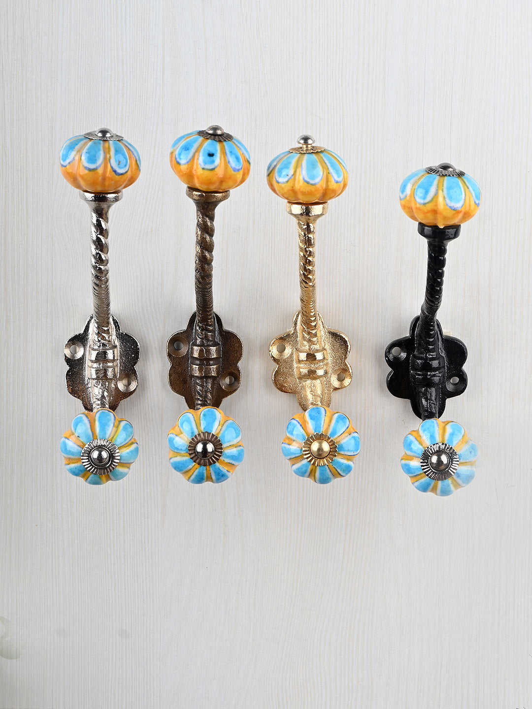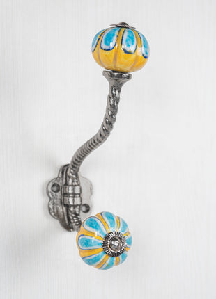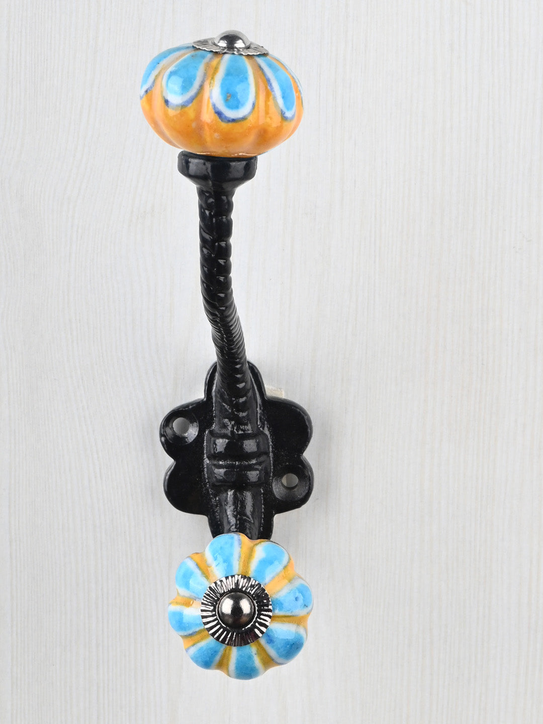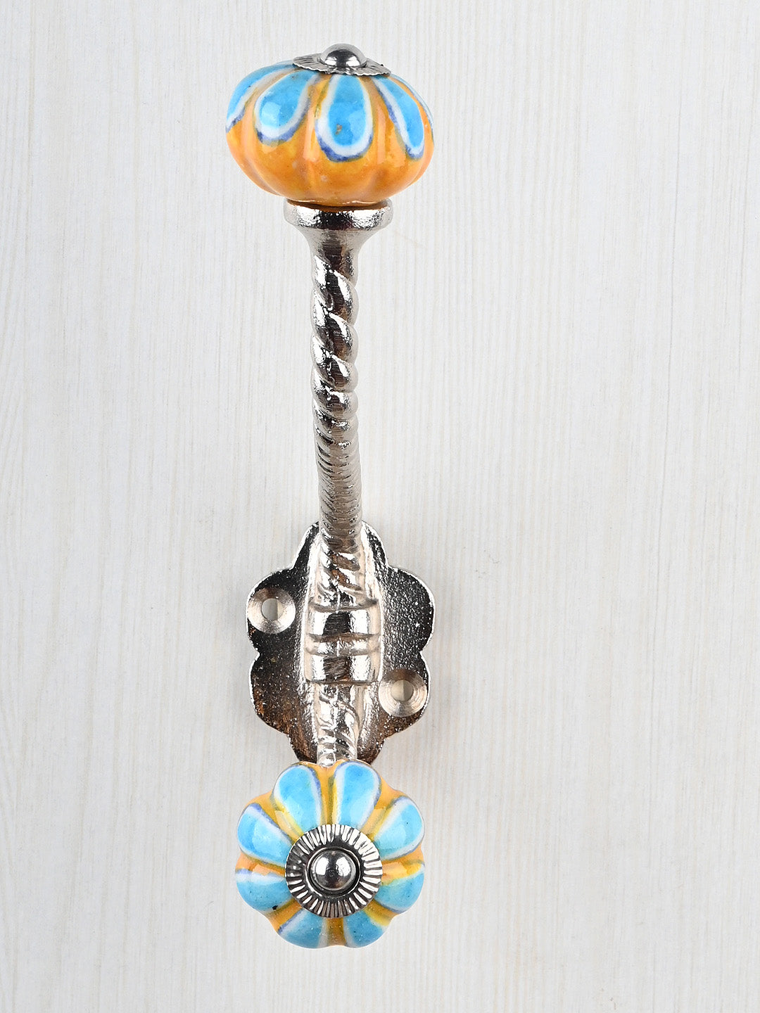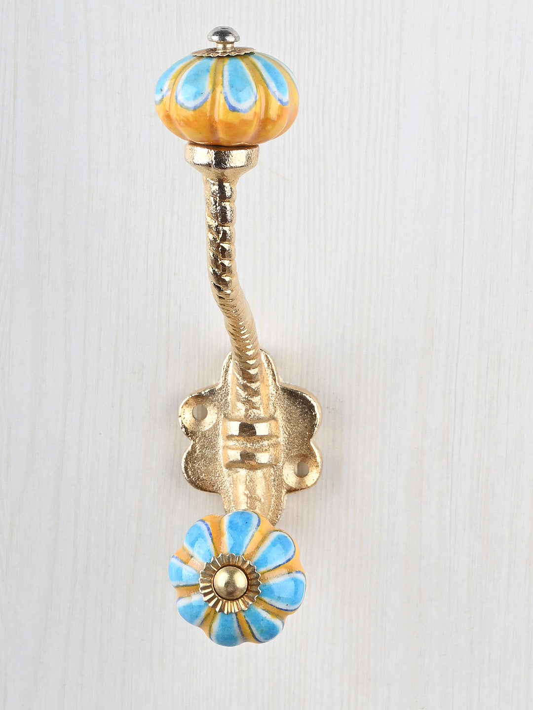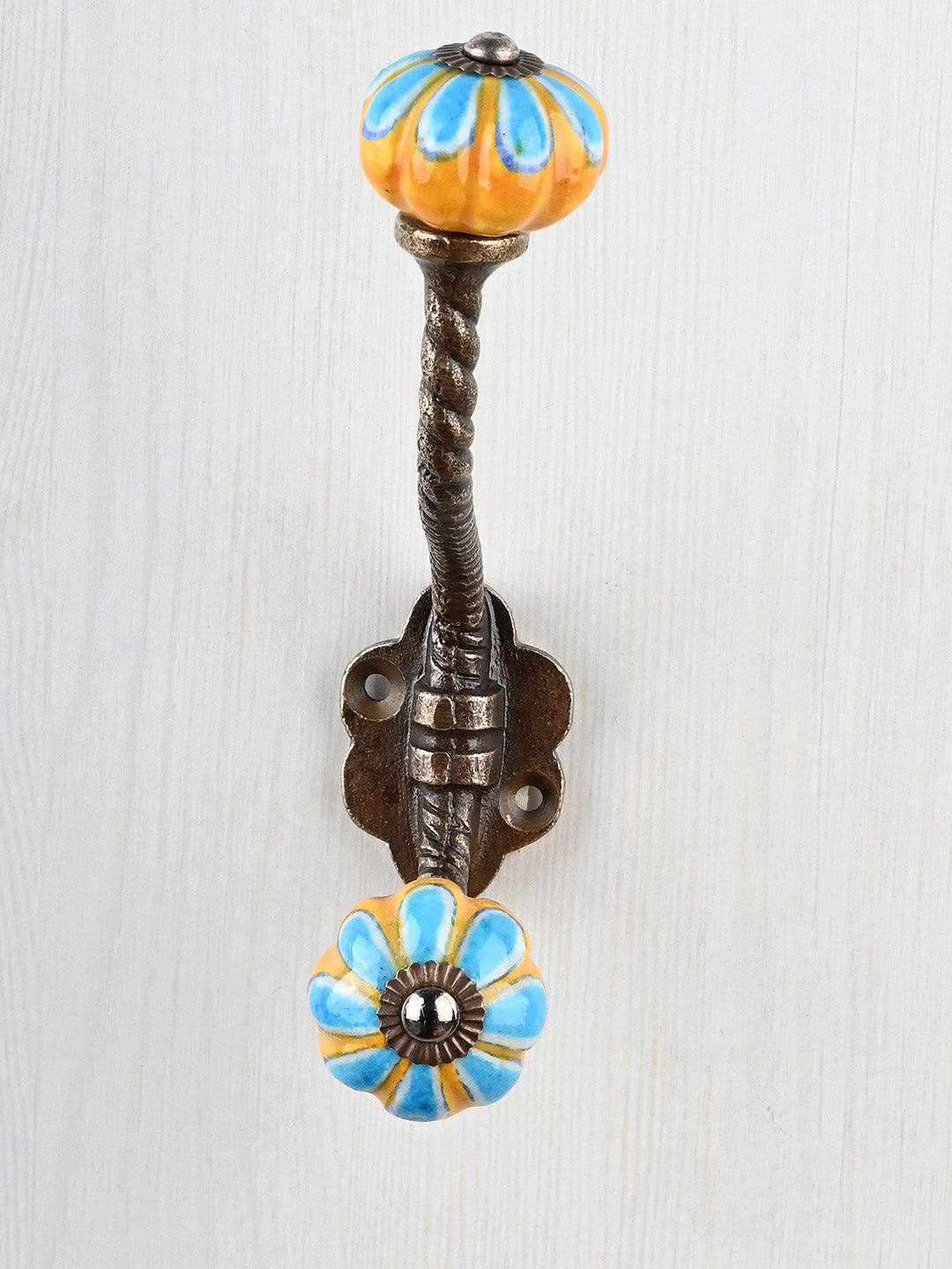 Turquoise Flower With Yellow Base Melon Shaped Knob With Metal Wall Hanger