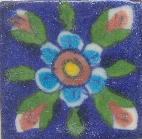 Turquoise Flowers With Brown and Yellow Center and green Leaves On Blue Tile