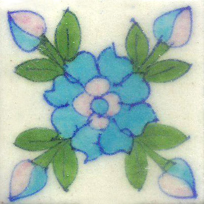 Turquoise Flowers WIth Green Leaves On White Base Tile