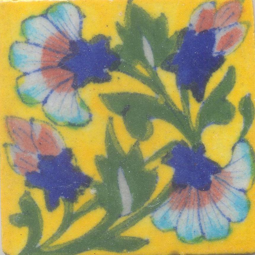 Turquoise,Blue and Brown Flowers and Green leaf with Yellow Base Tile