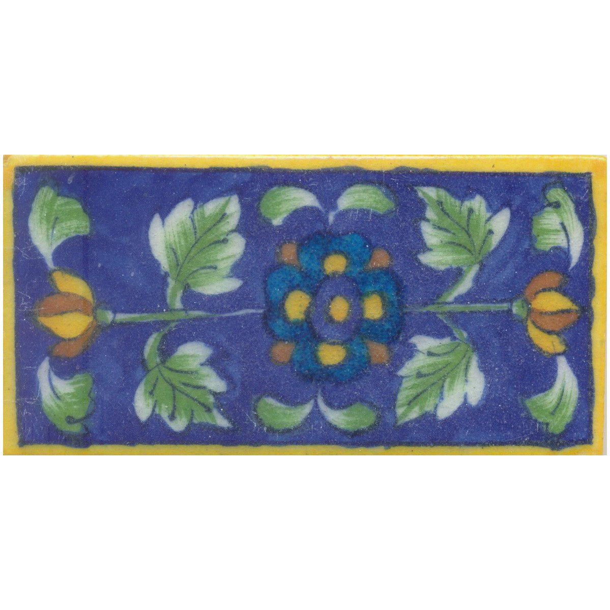 Turquoise,Yellow and Blue Flower and Green Shading leaf with Blue Base Tile
