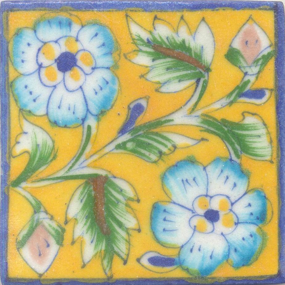 Turquoise,yellow and Blue Flowers and Lime Green leaf with Yellow Base Tile
