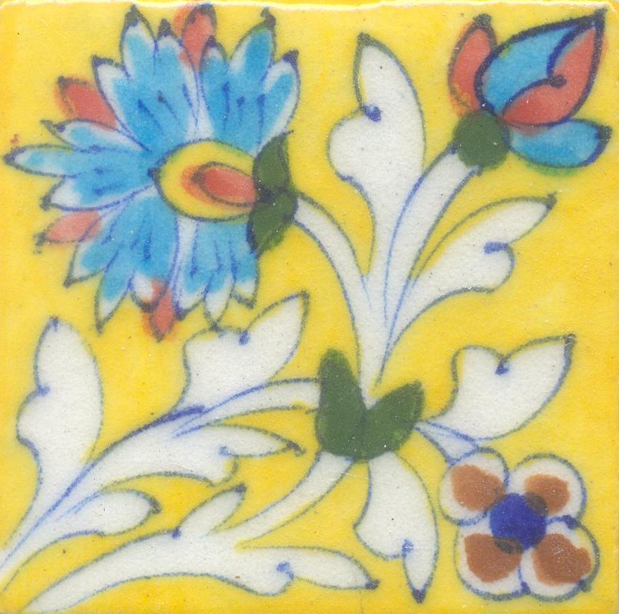 Turquoise,Yellow and Brown Flower and White leaf with Yellow Base Tile