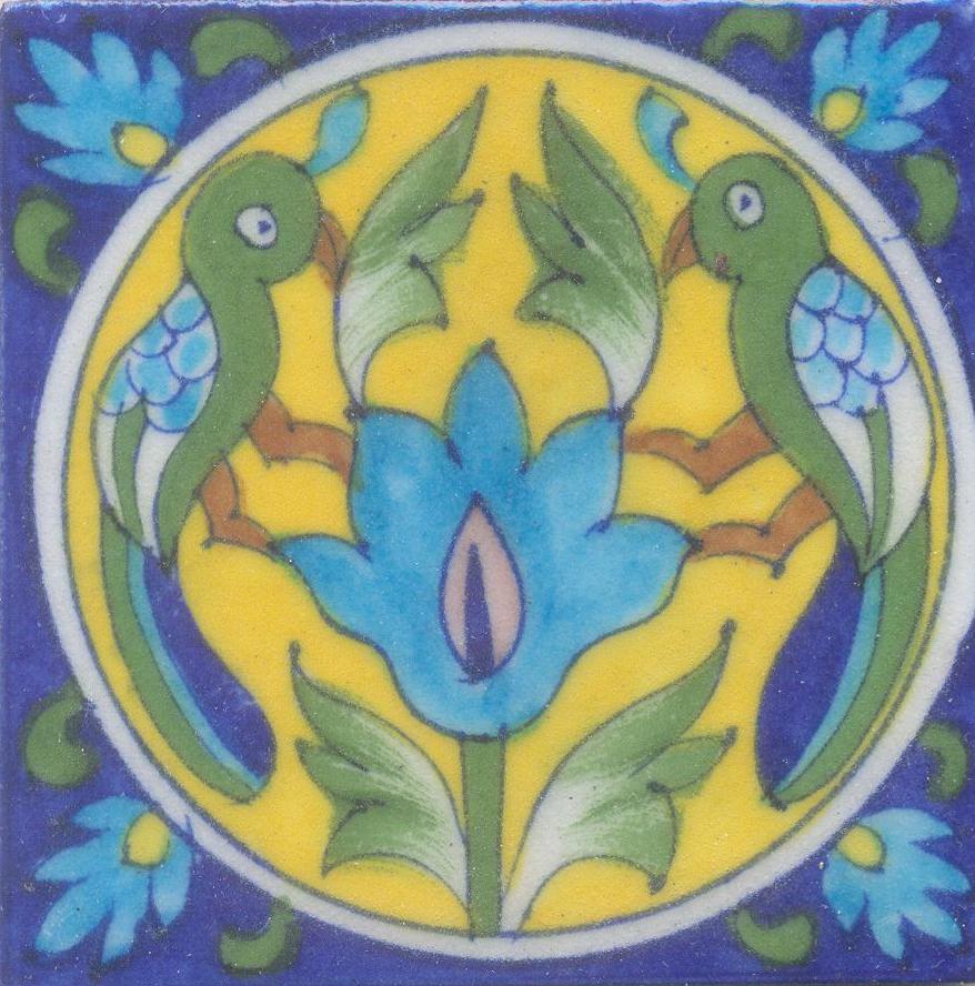 Two Turquoise and Green Birds and Turquoise Flowers and Lime Green leaf with Blue and Yellow Base Tile