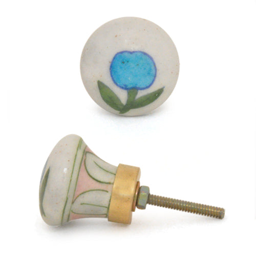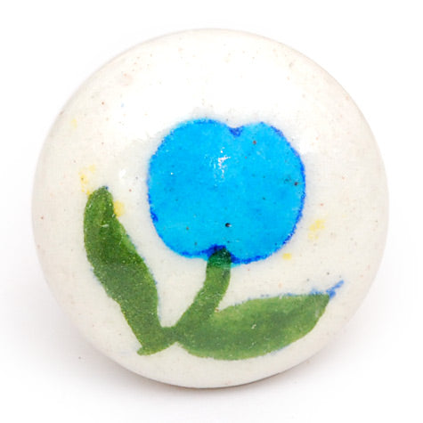 Vintage White Blue Pottery Knob With Turquoise Flower