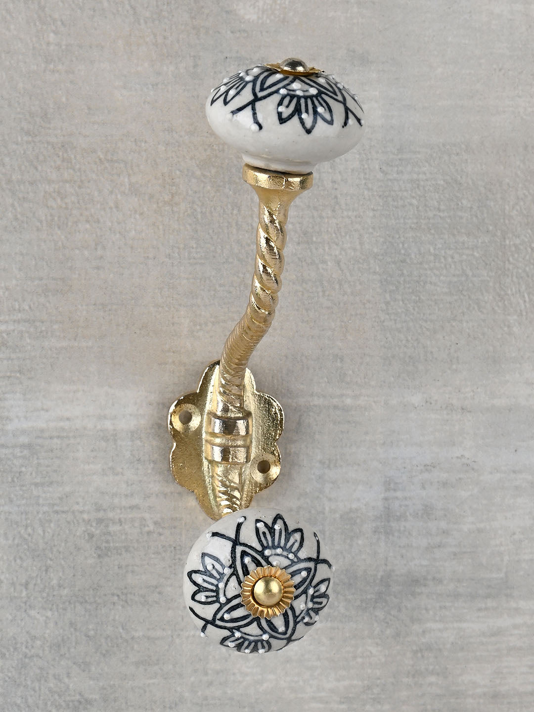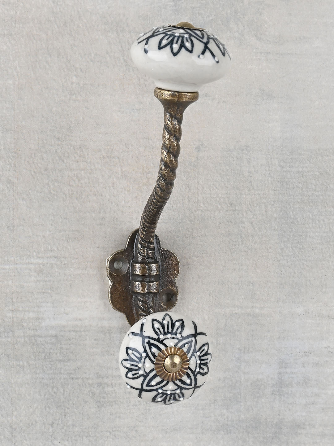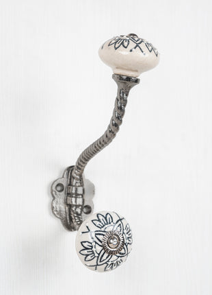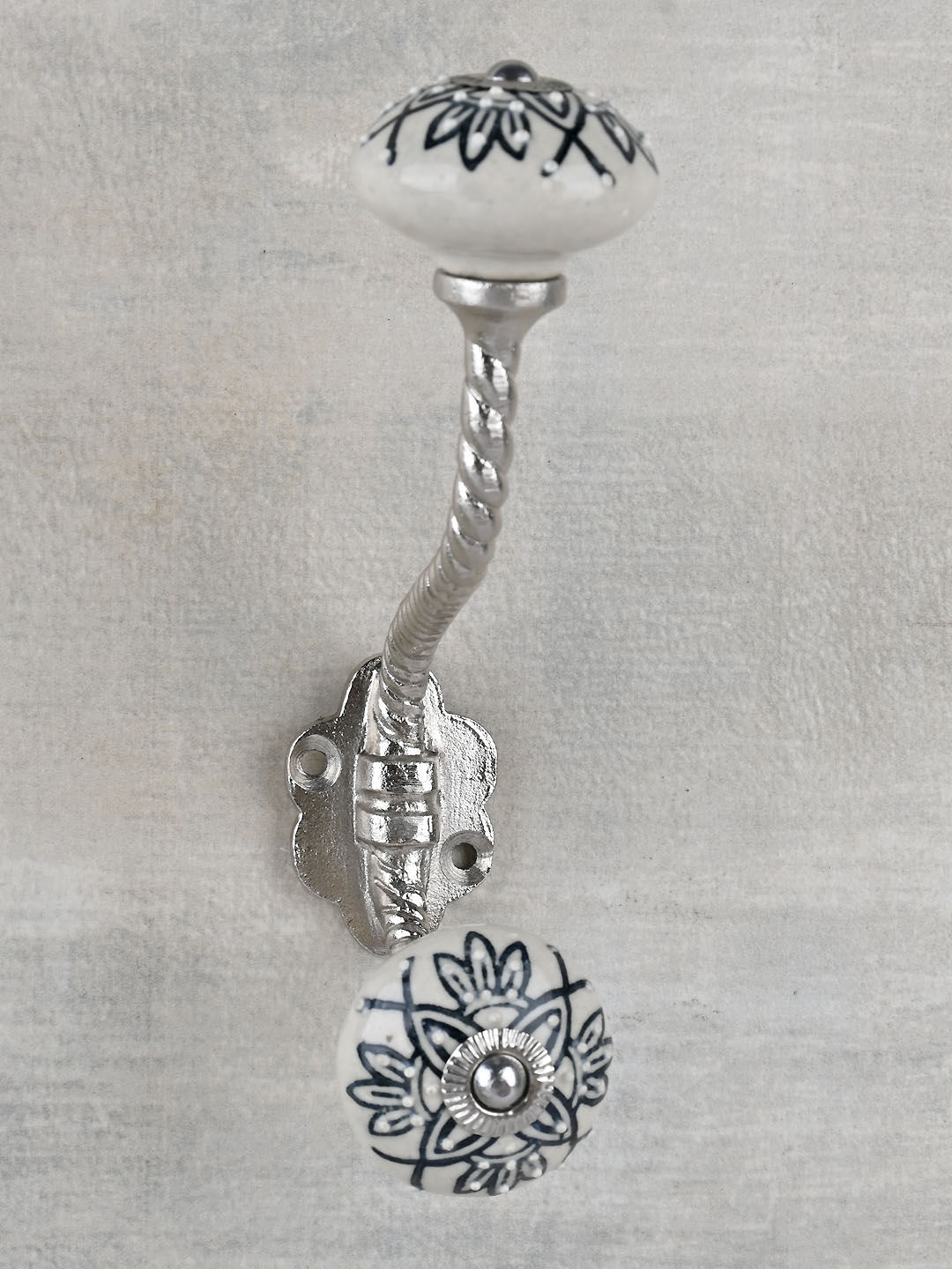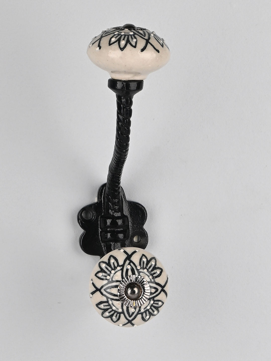 Vintage White Ceramic Knob Black Designer Print With Metal Wall Hanger