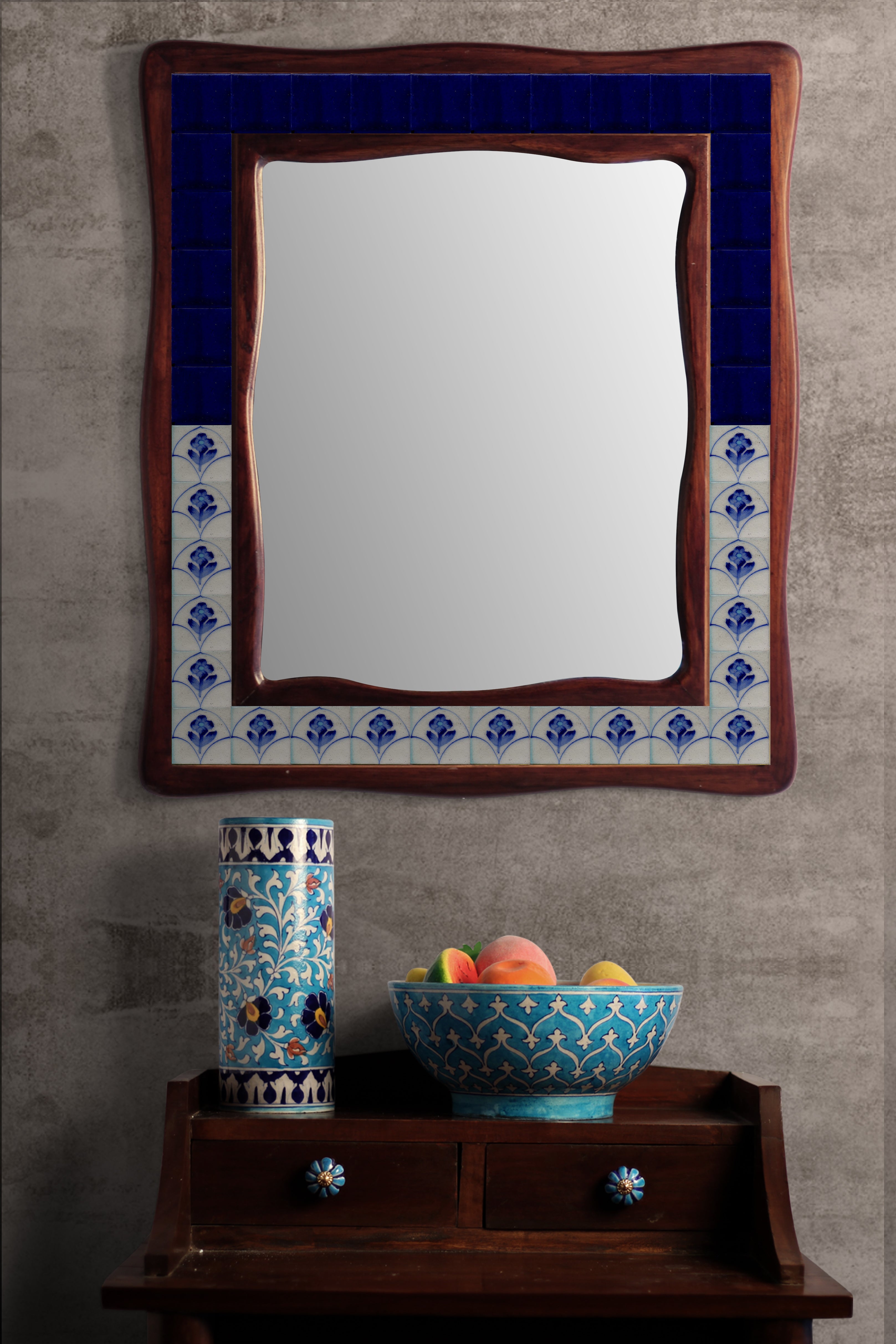 White And Blue Floral Design On White Tile Mirror In Wooden Frame