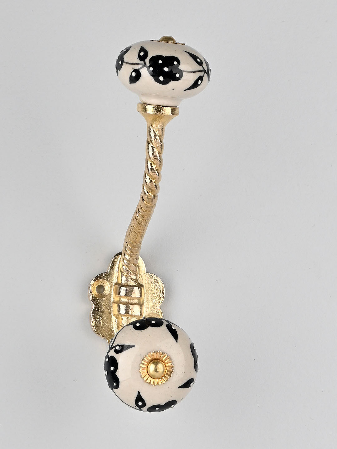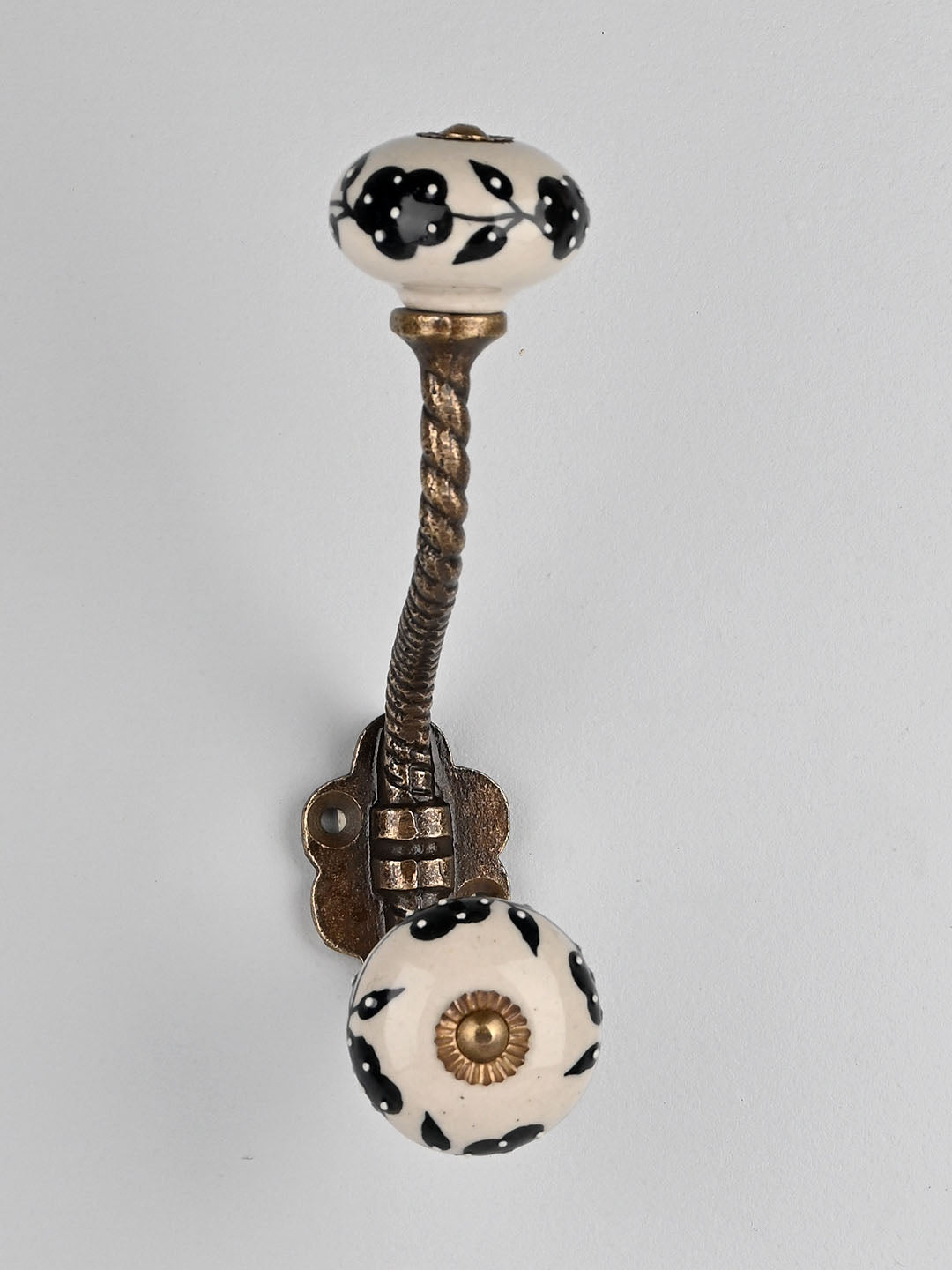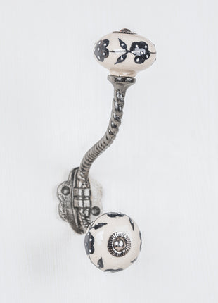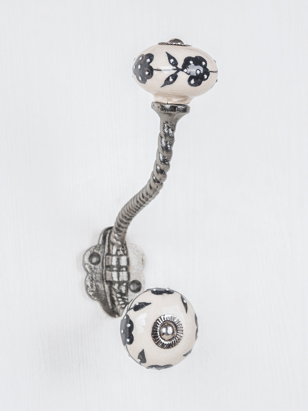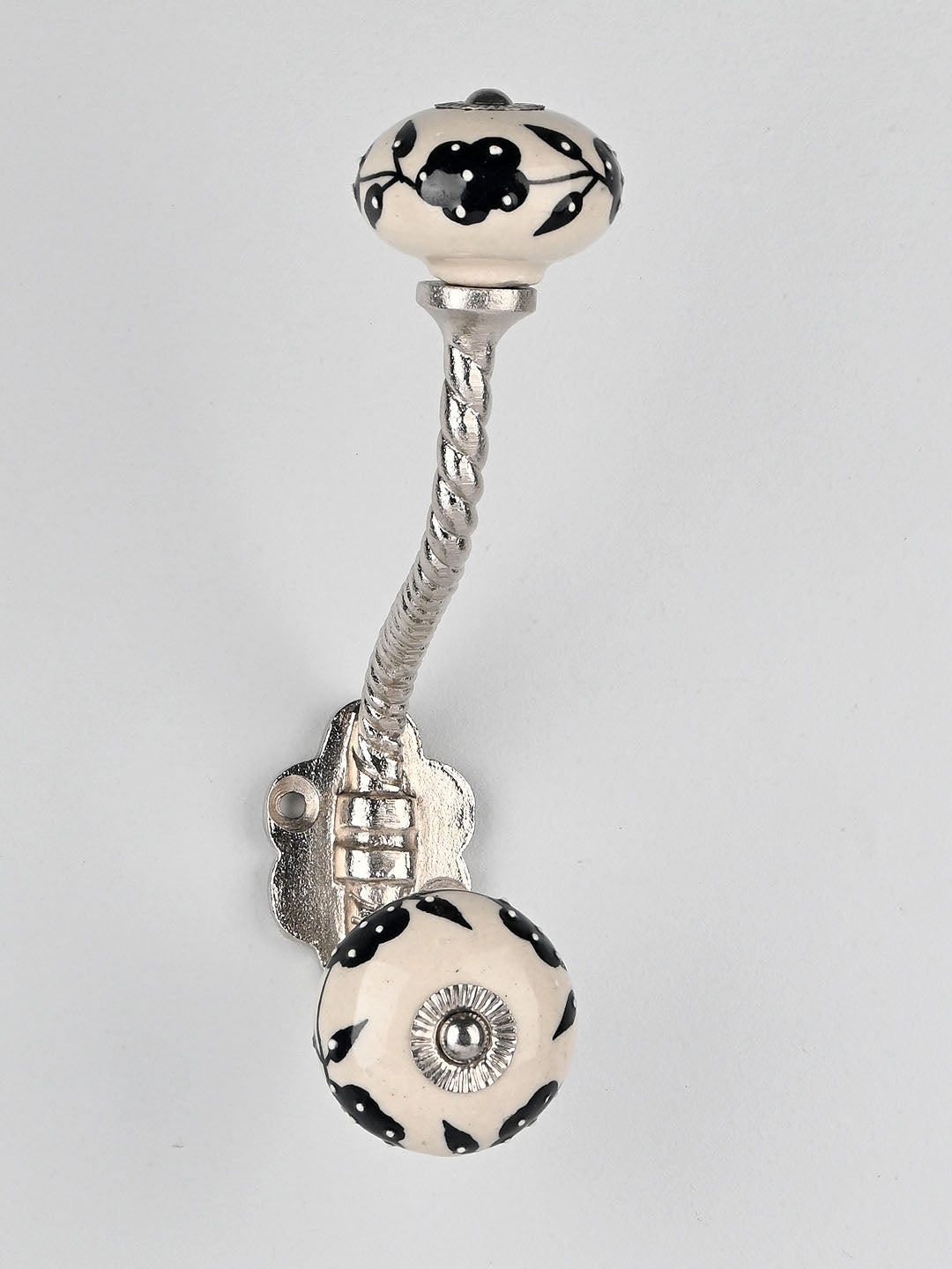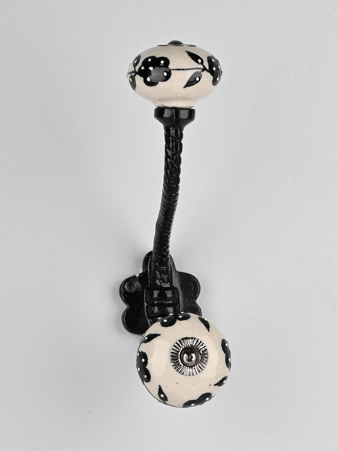 White Base Ceramic Knob Black Floral Print With Metal Wall Hanger