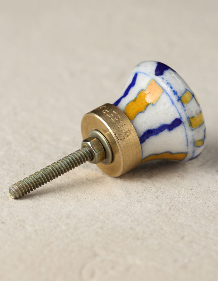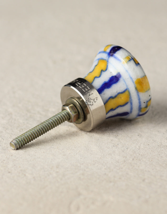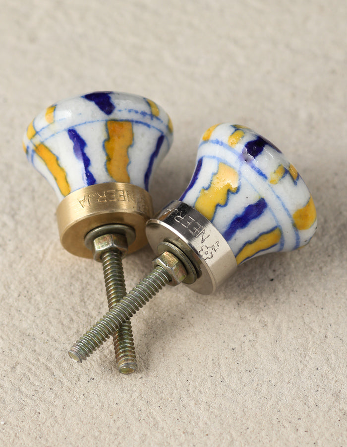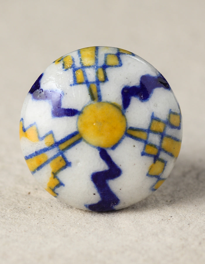White Ceramic Blue Pottery Door Knob With Yellow And Blue Print