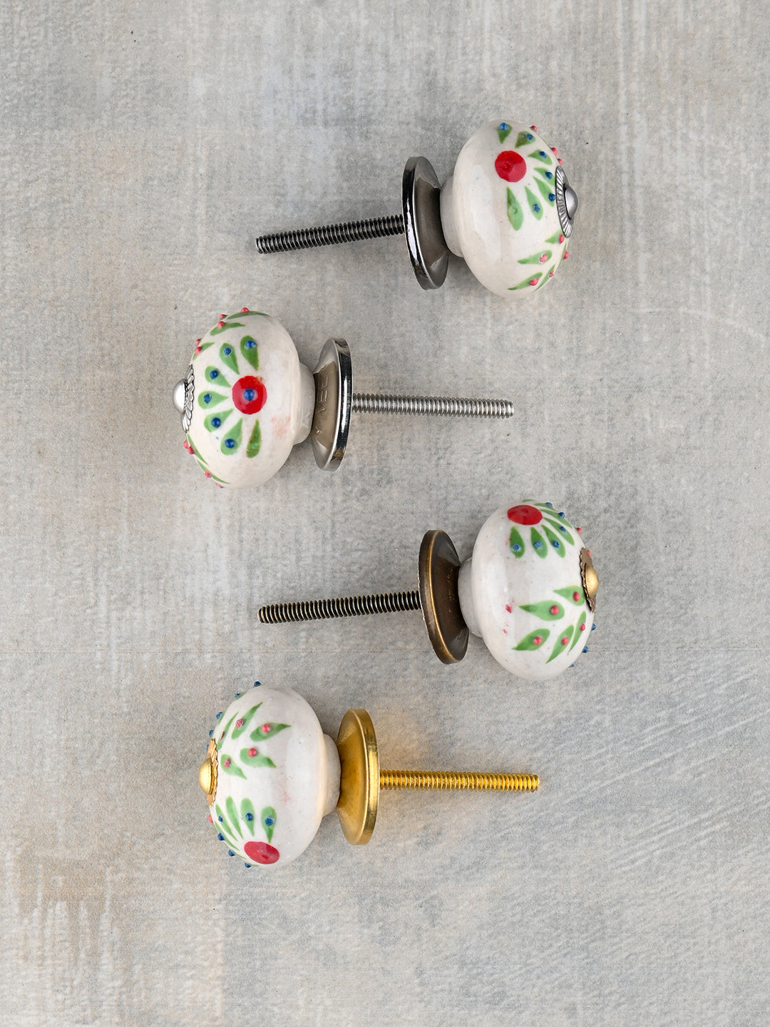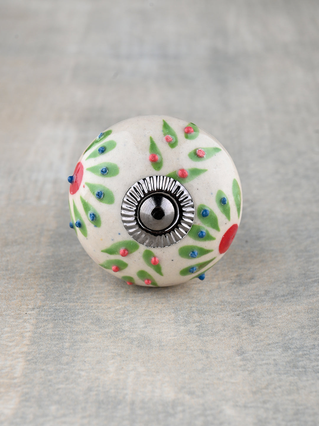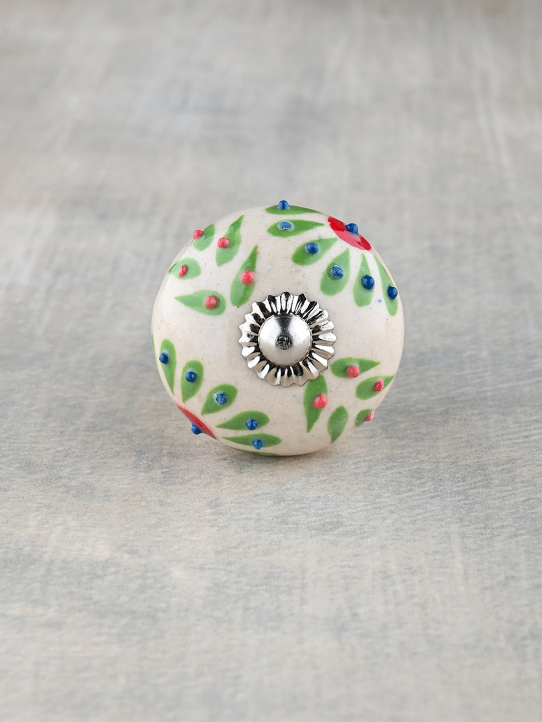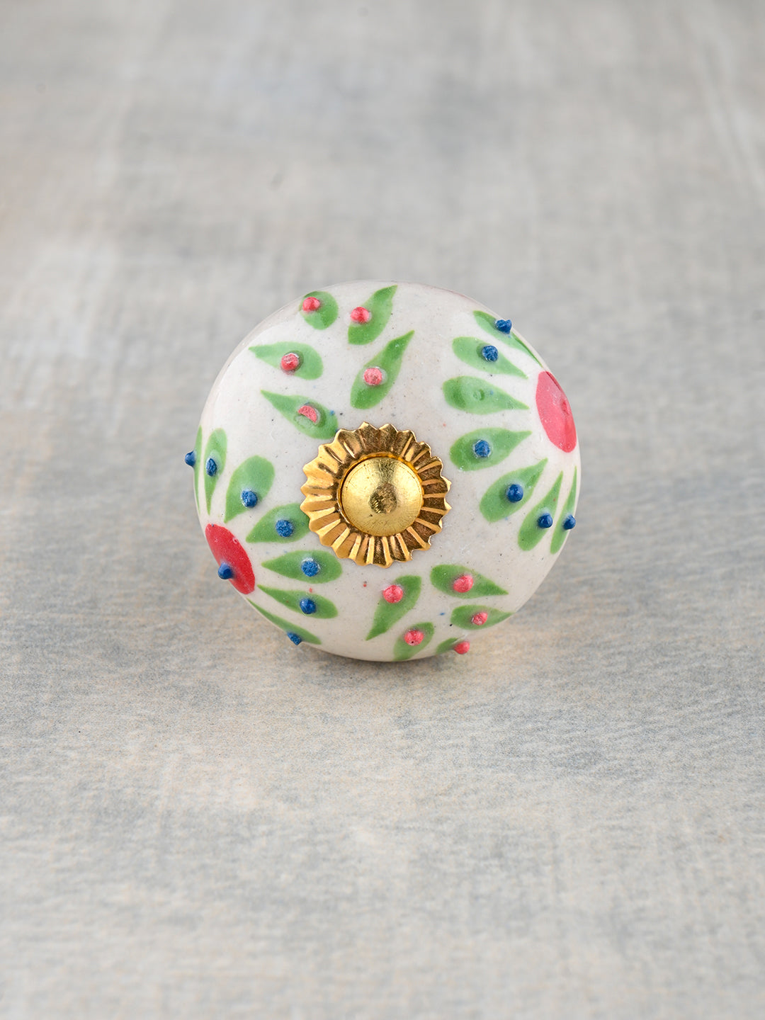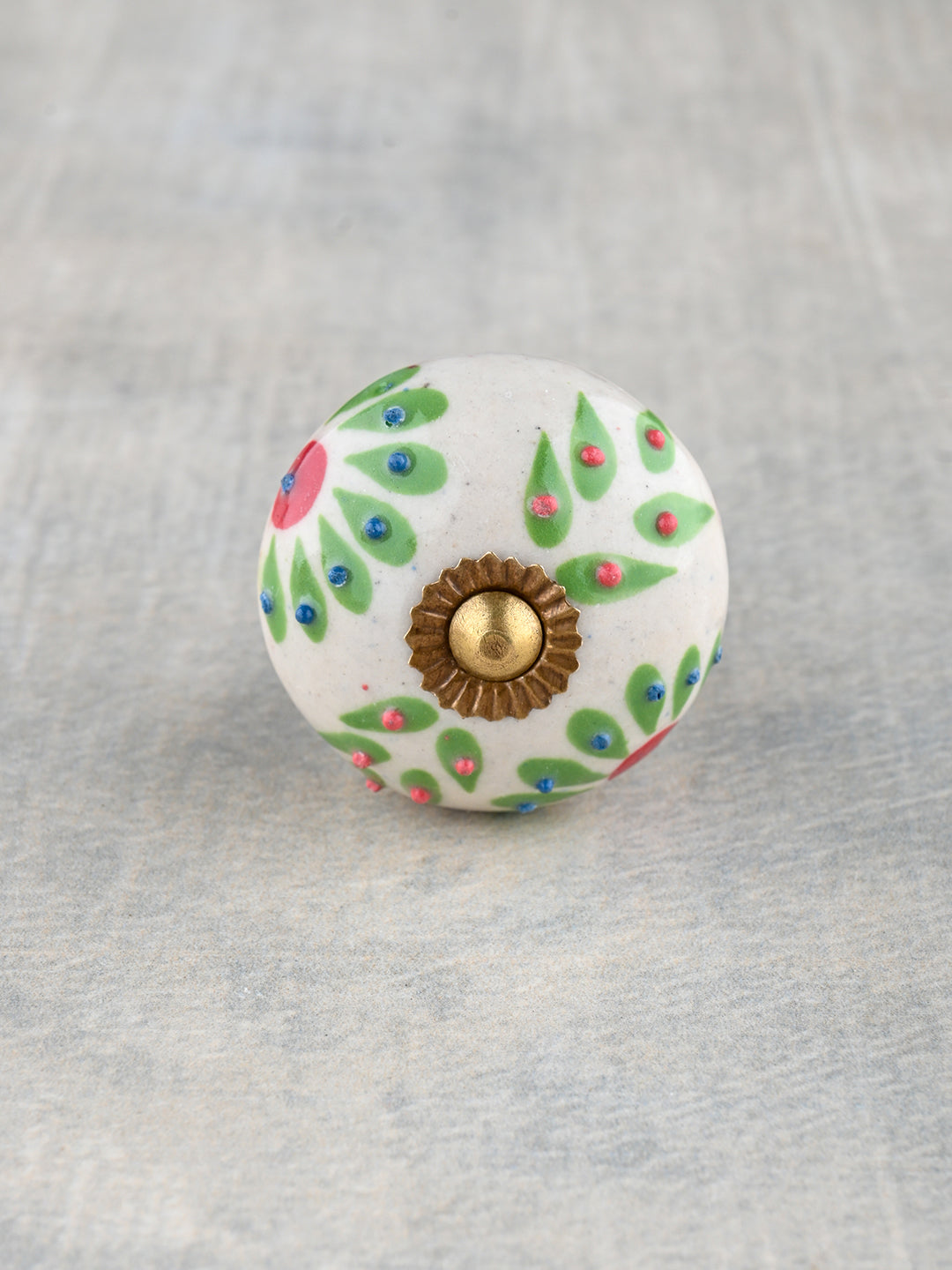 White Ceramic Dresser Cabinet Knob With Green Petal Design