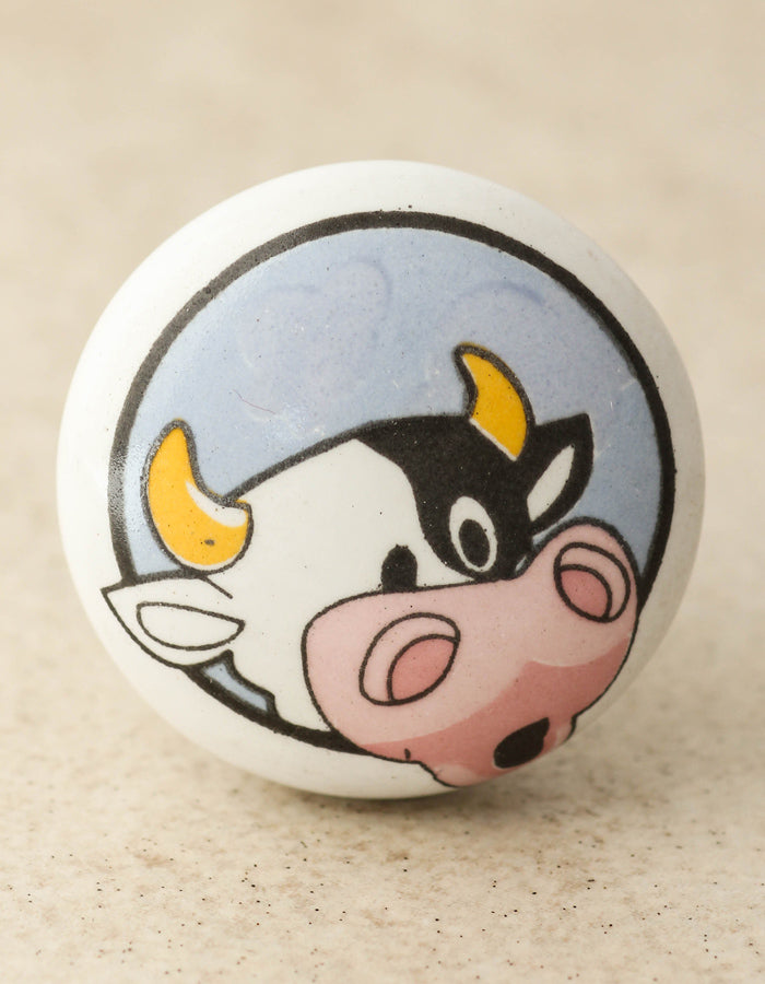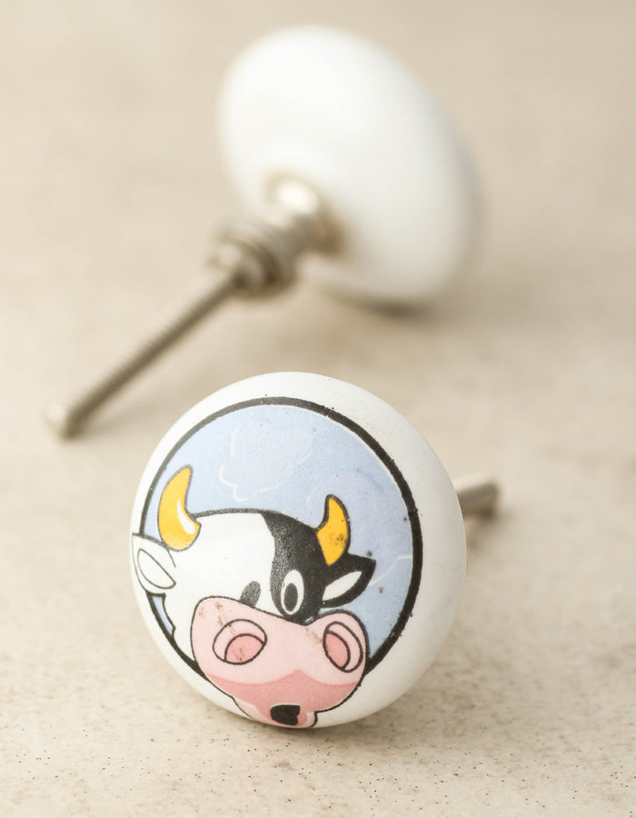 White Ceramic Knob With Beautifully Crafted Cow Design For Kids