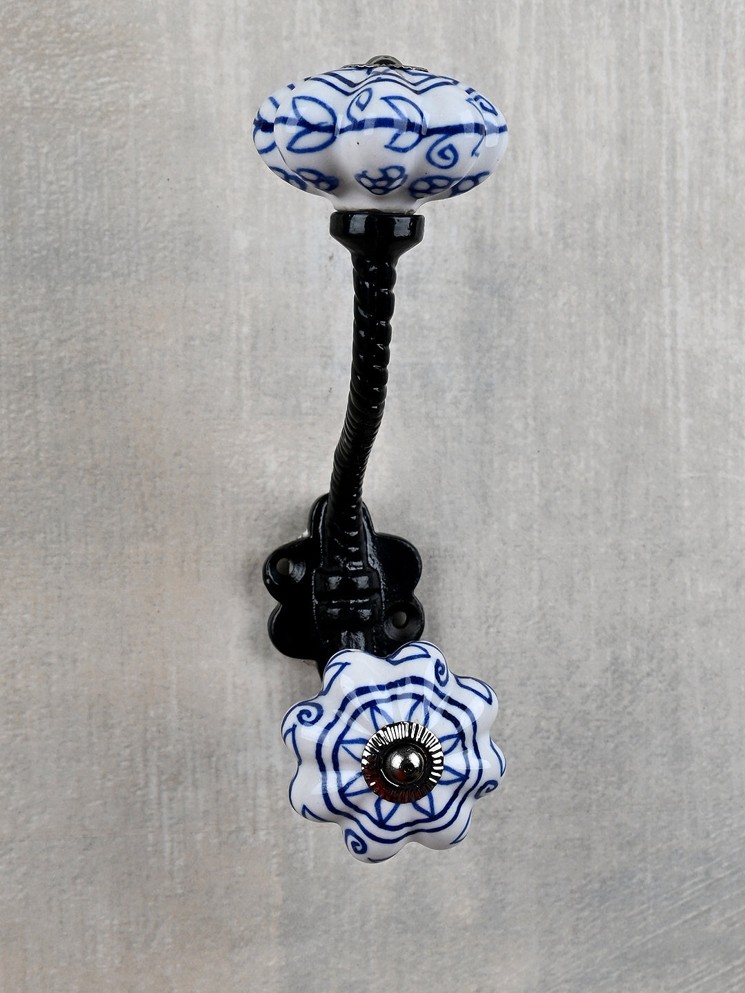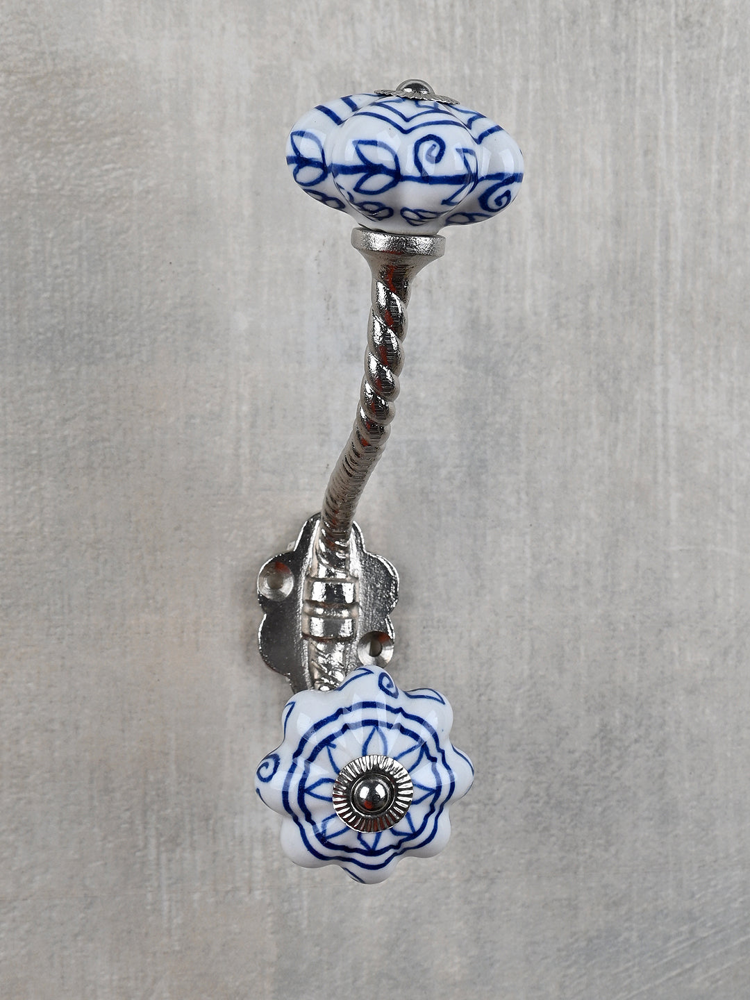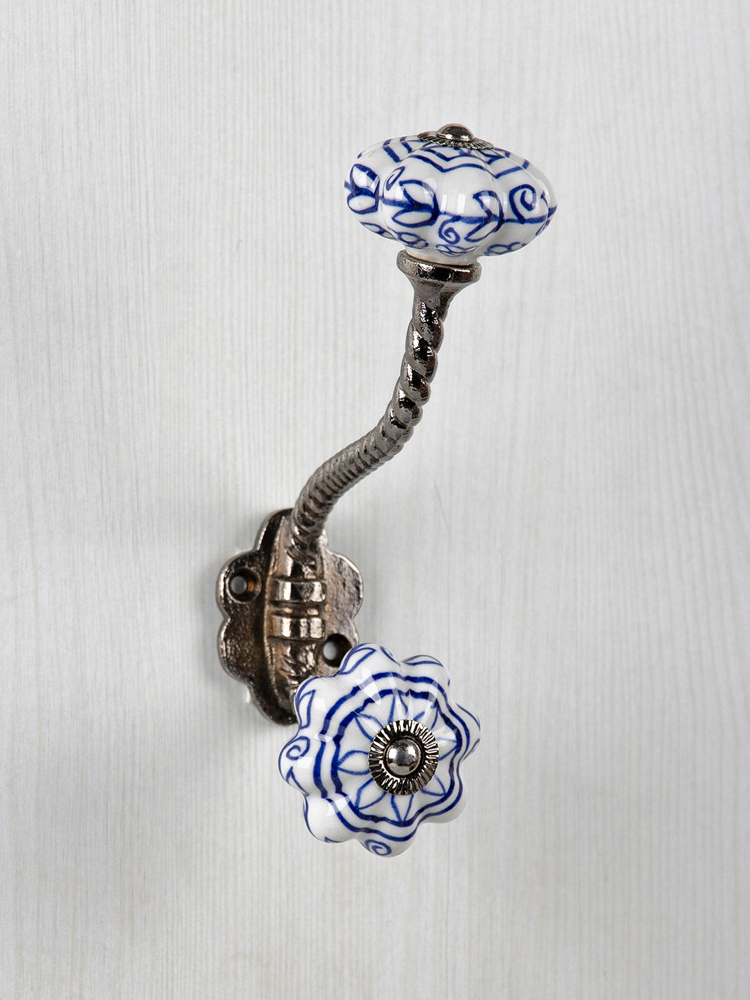 White Ceramic Knob With Floral Design Metal Wall Hanger
