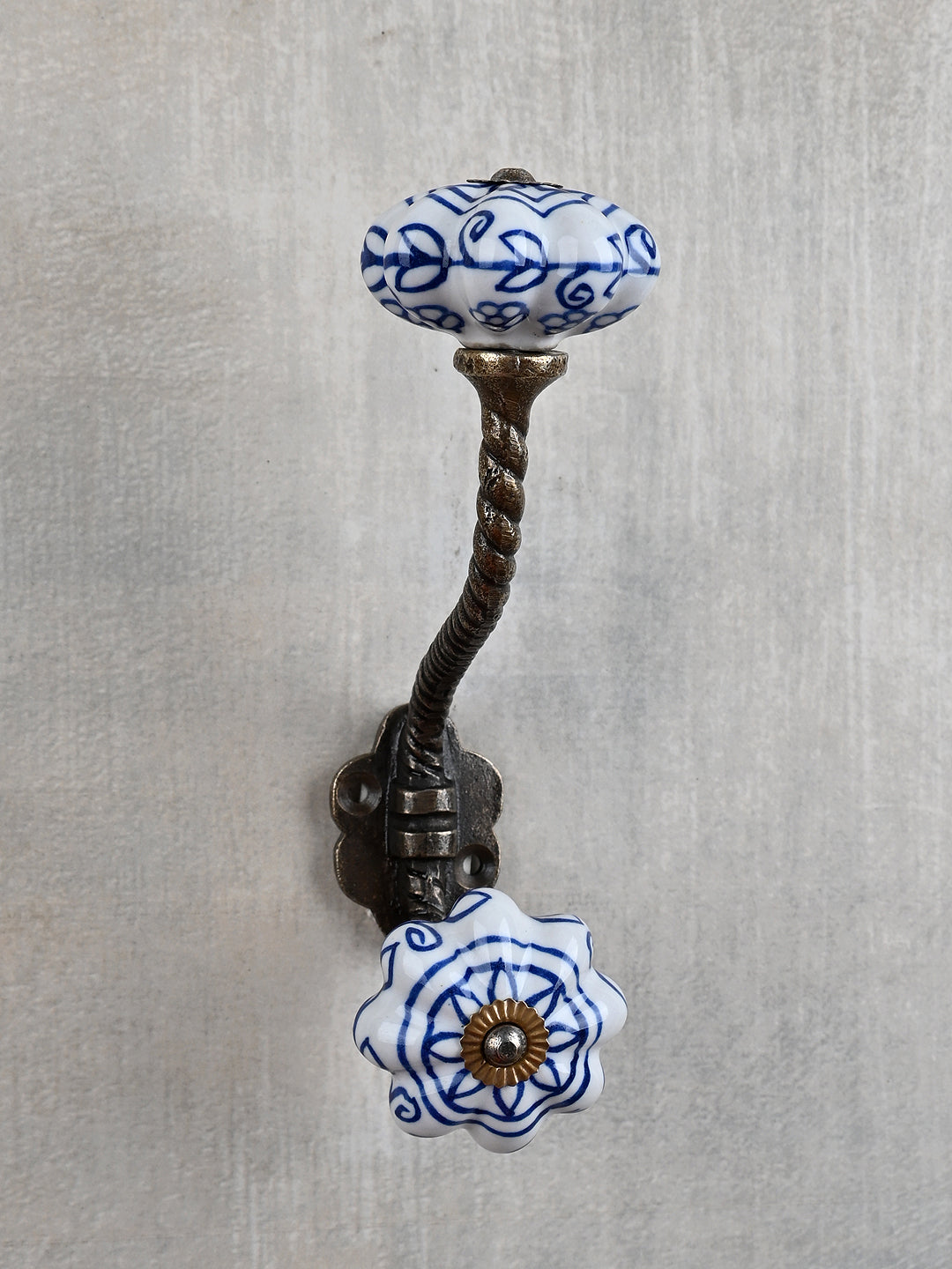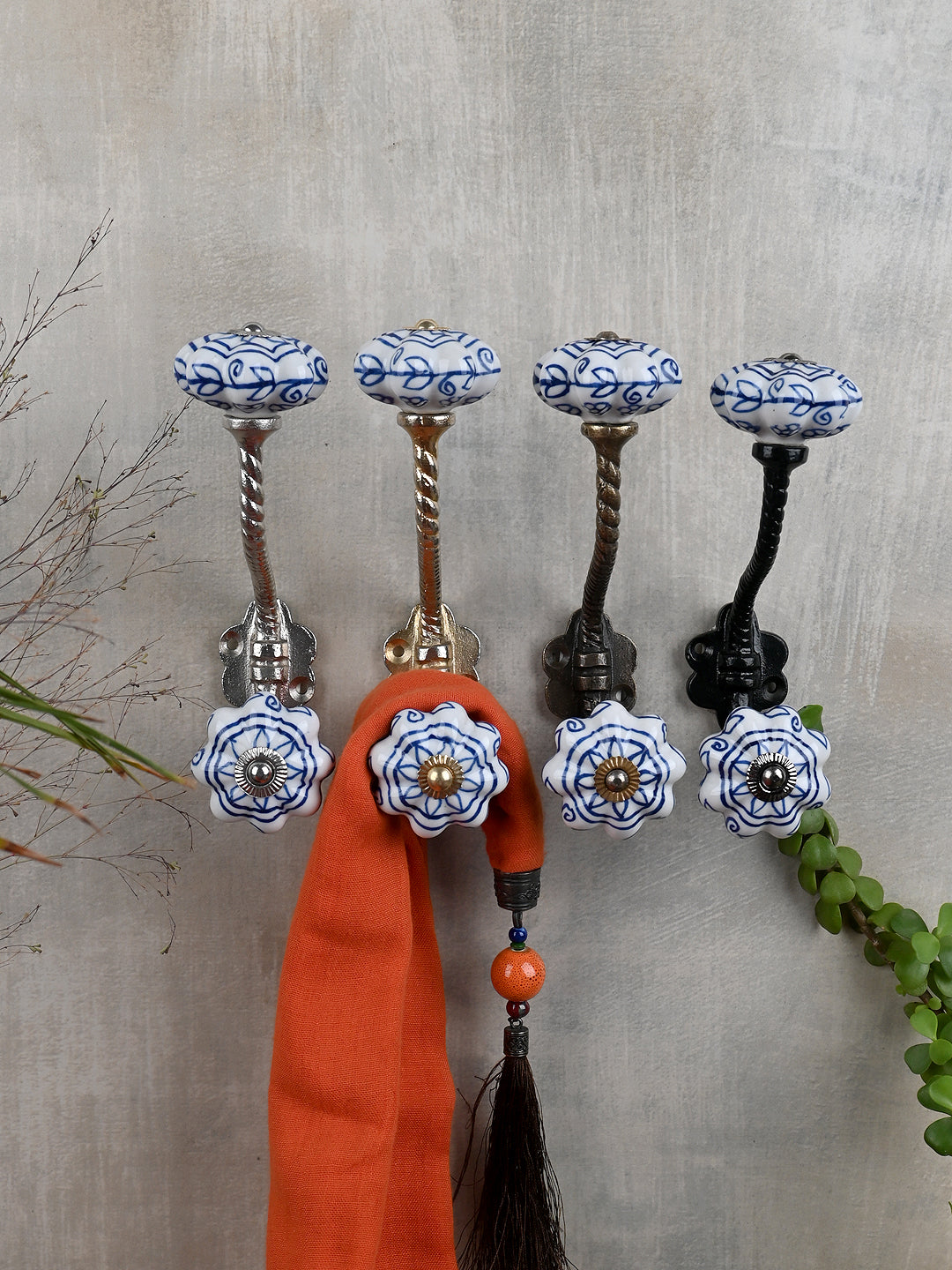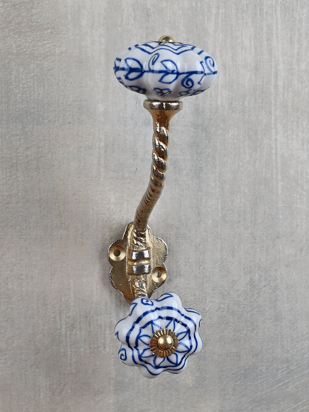 White Ceramic Knob With Floral Design Metal Wall Hanger