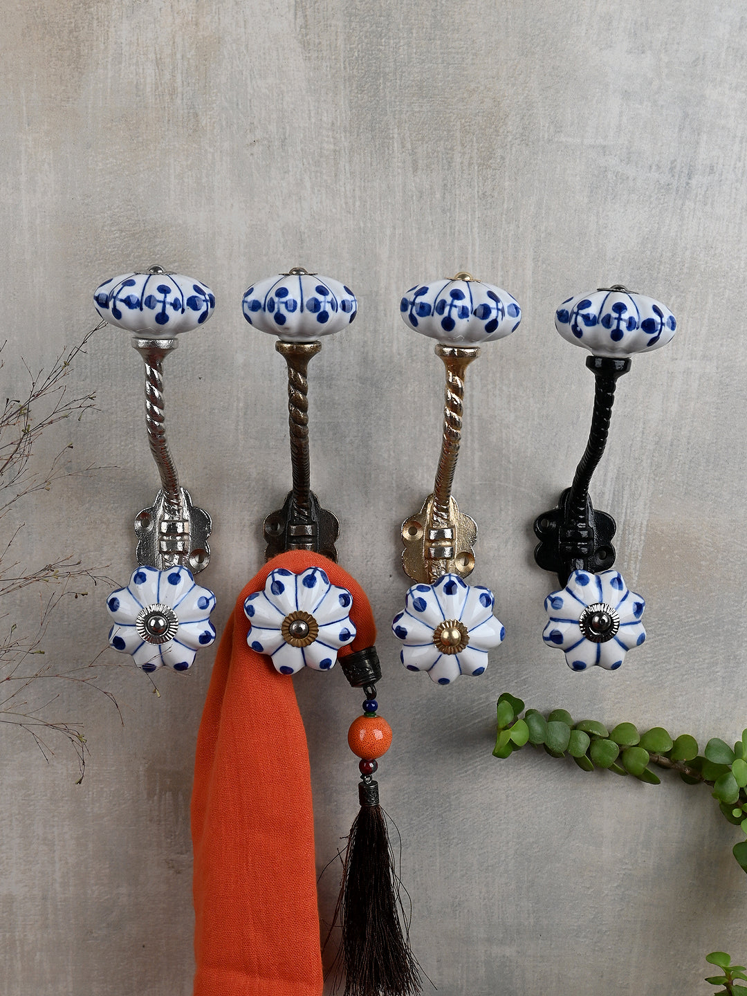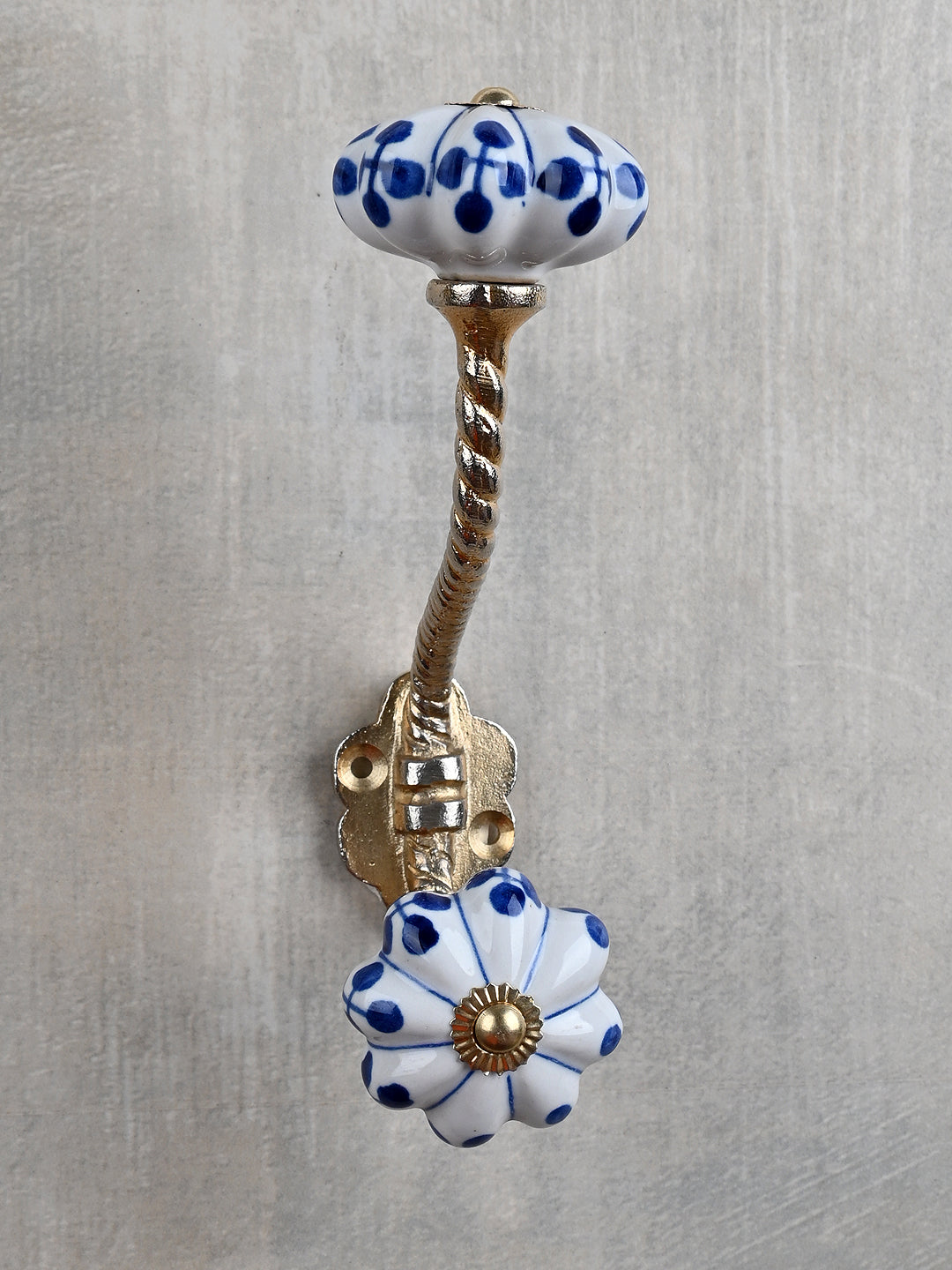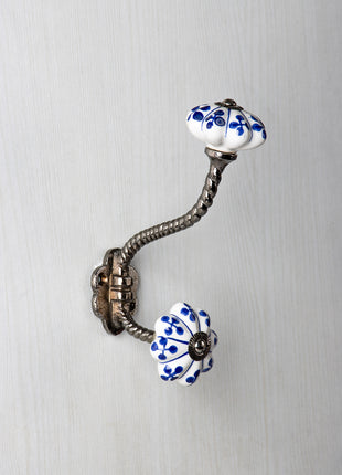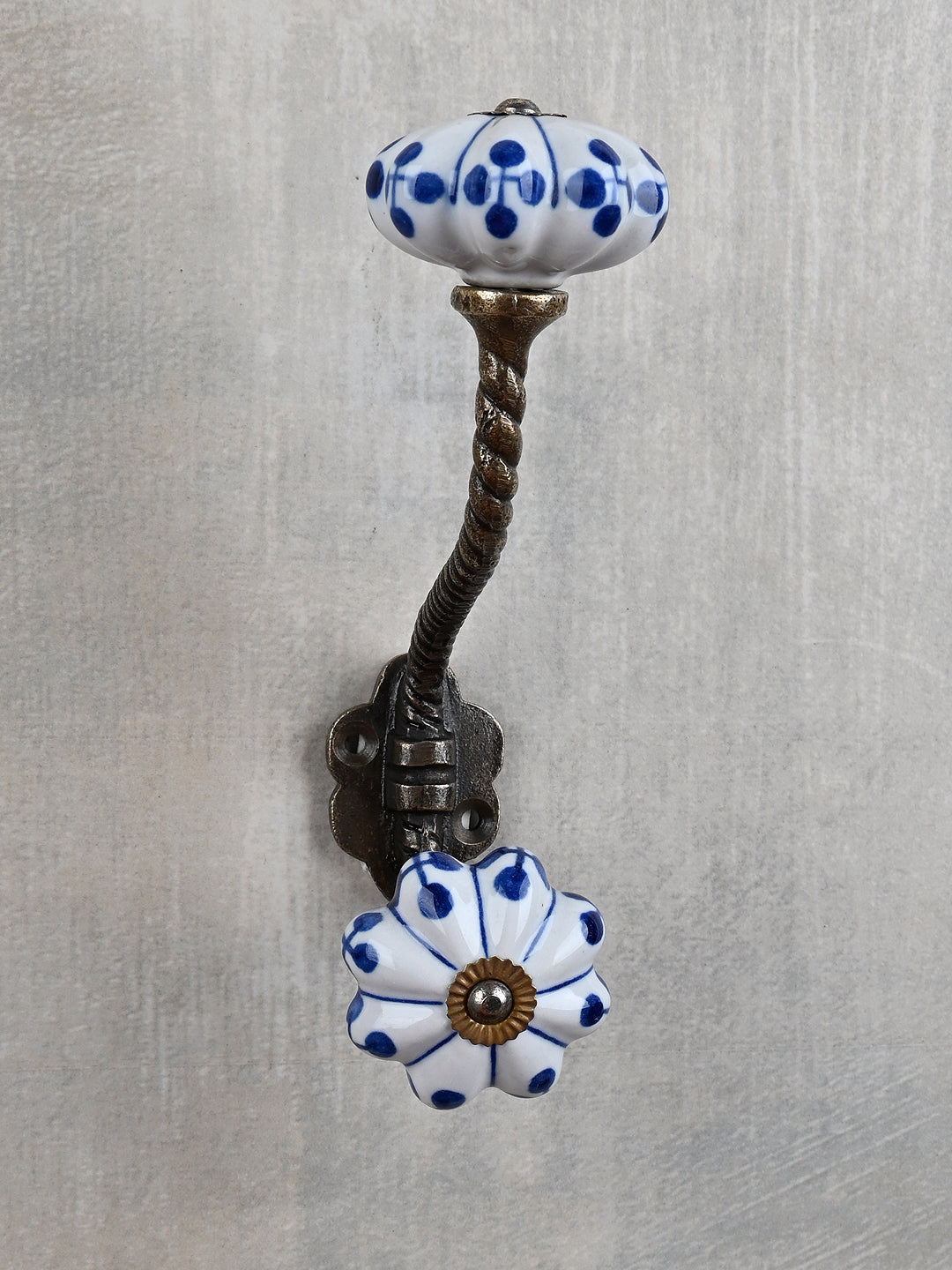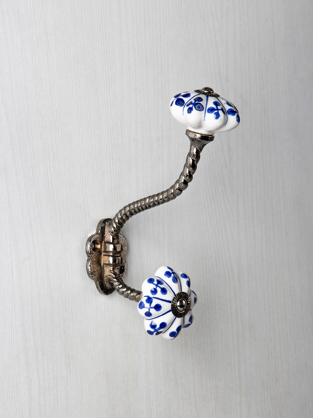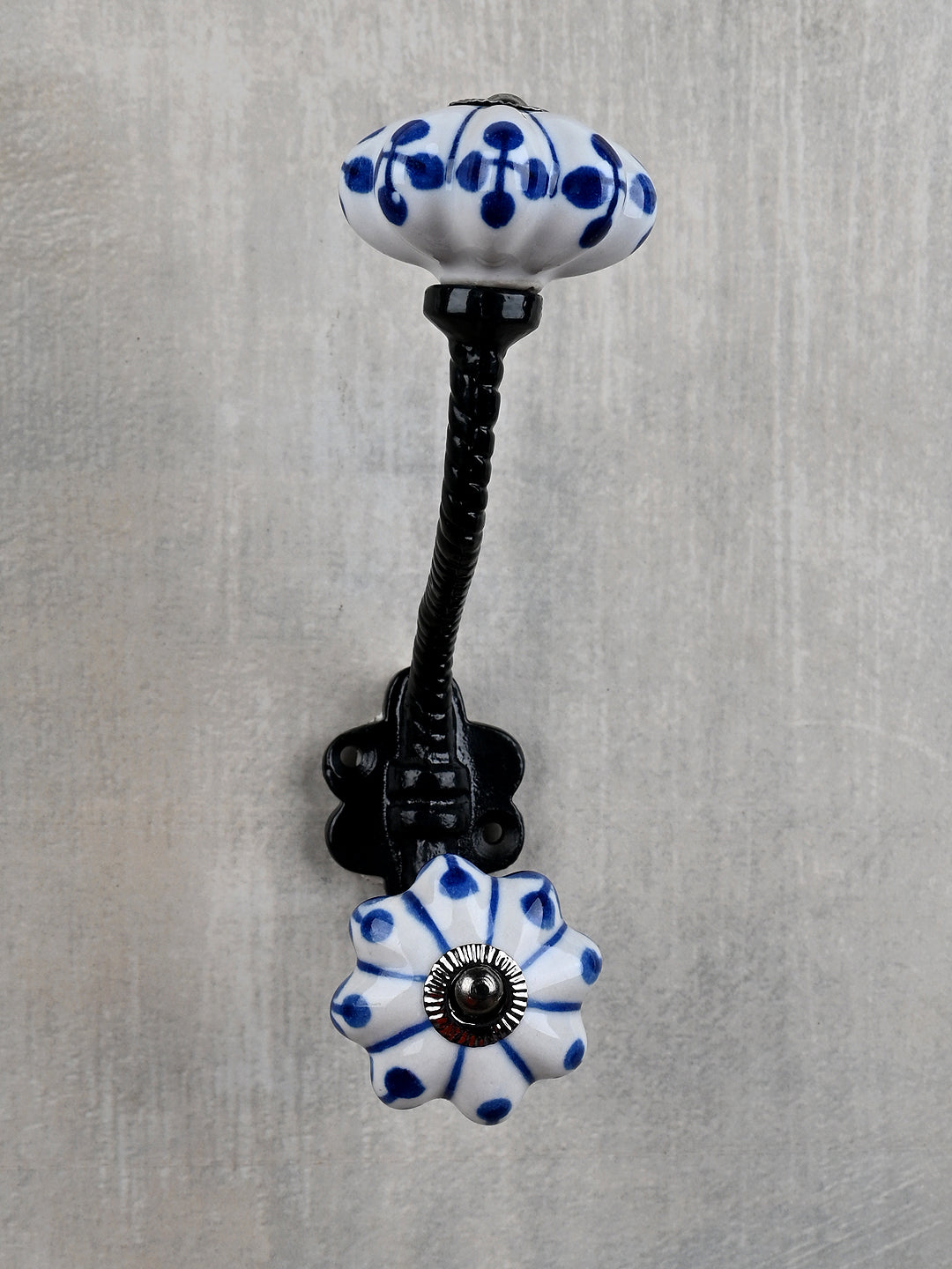 White Floral Ceramic Cabinet Knob With Blue Design With Metal Wall Hanger