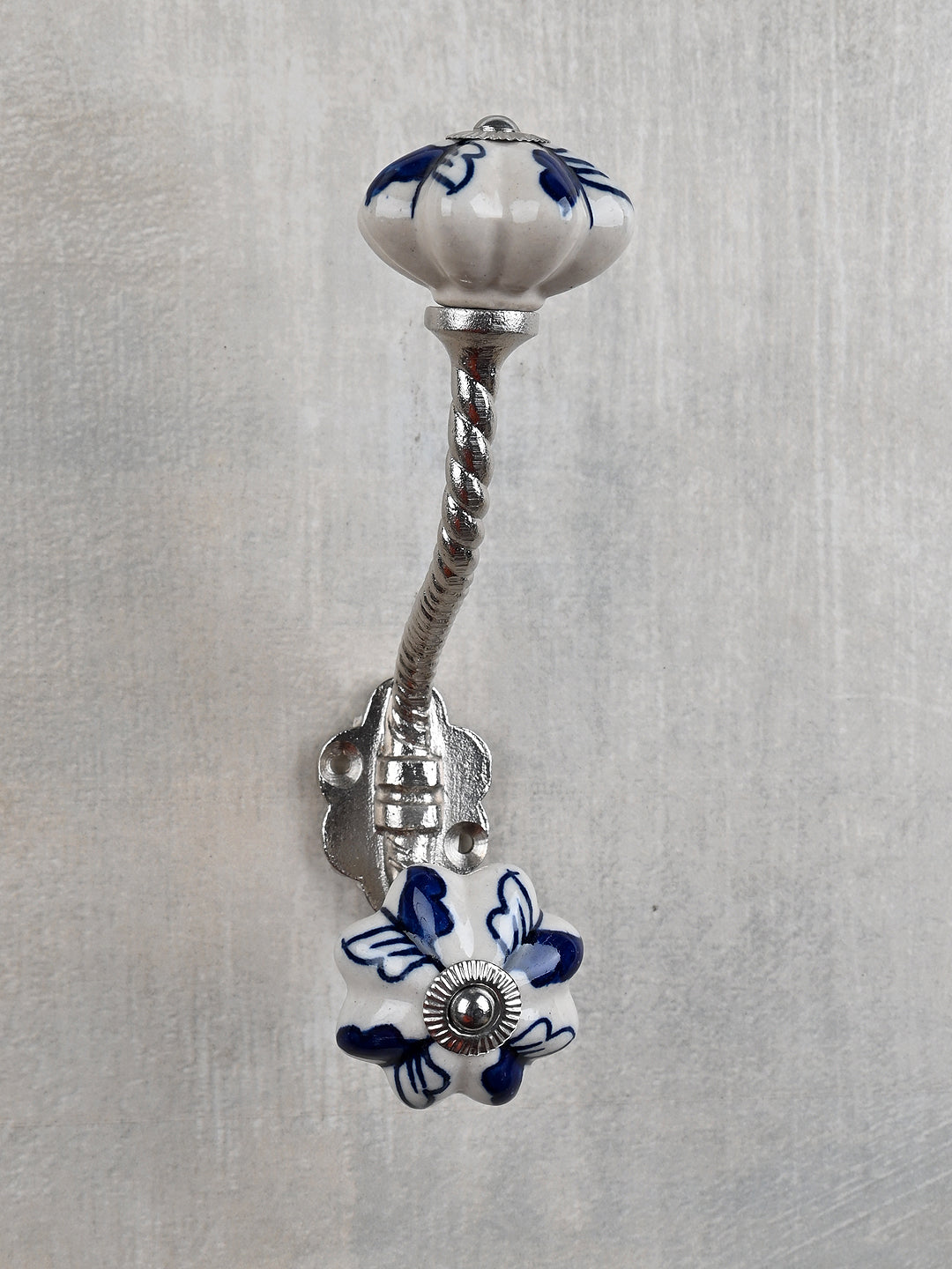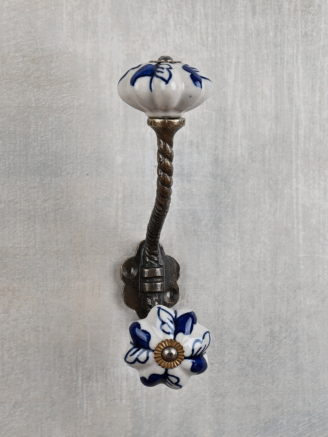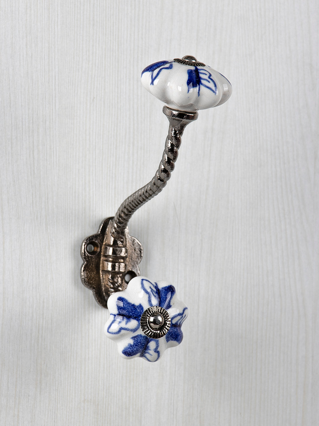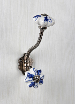White Floral Ceramic Knob With Handpainted Blue Flowers With Metal Wall Hanger