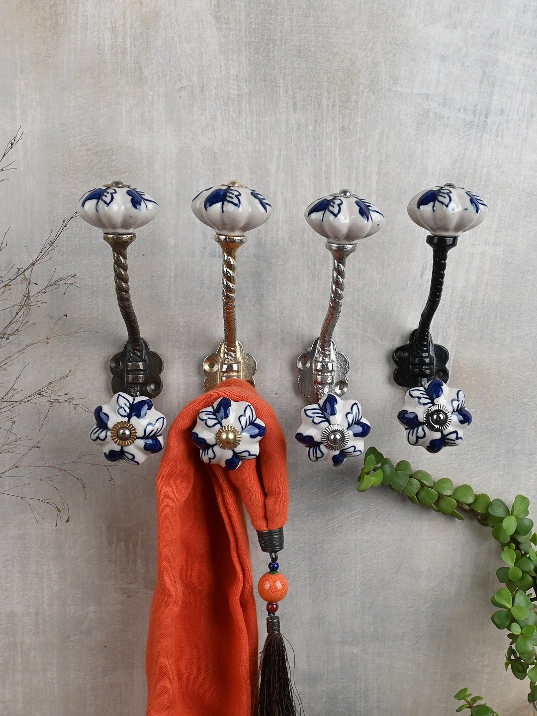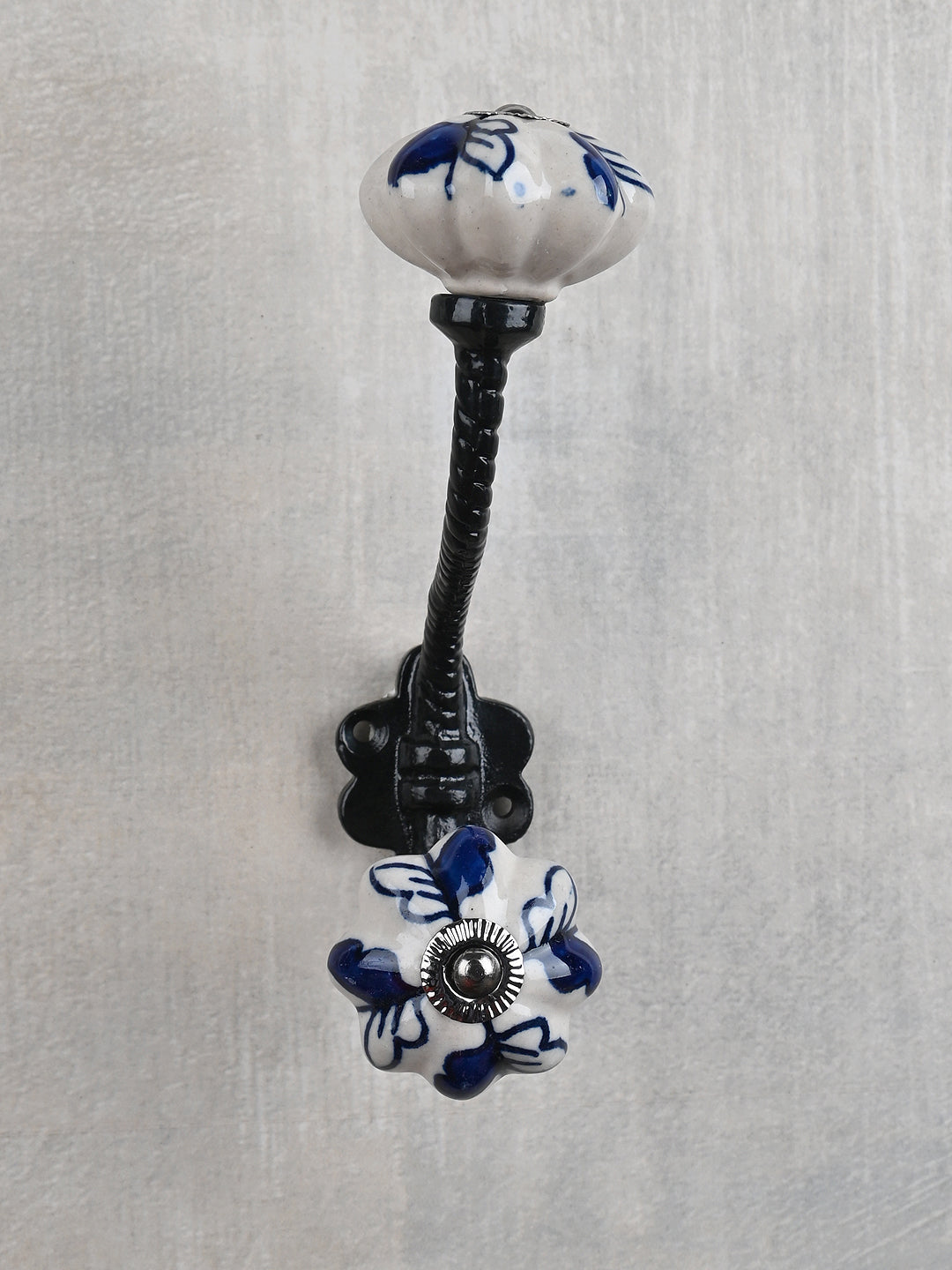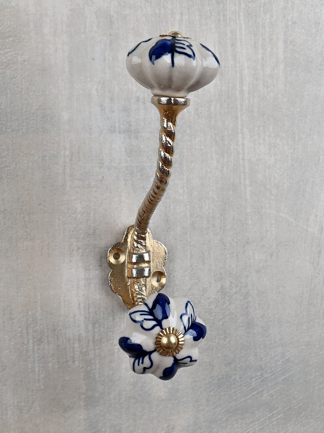 White Floral Ceramic Knob With Handpainted Blue Flowers With Metal Wall Hanger