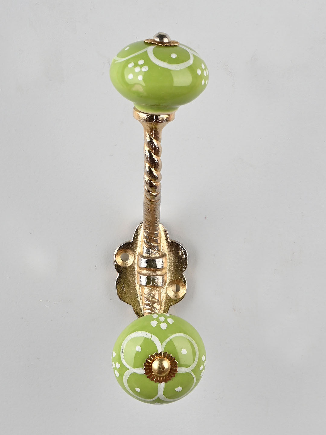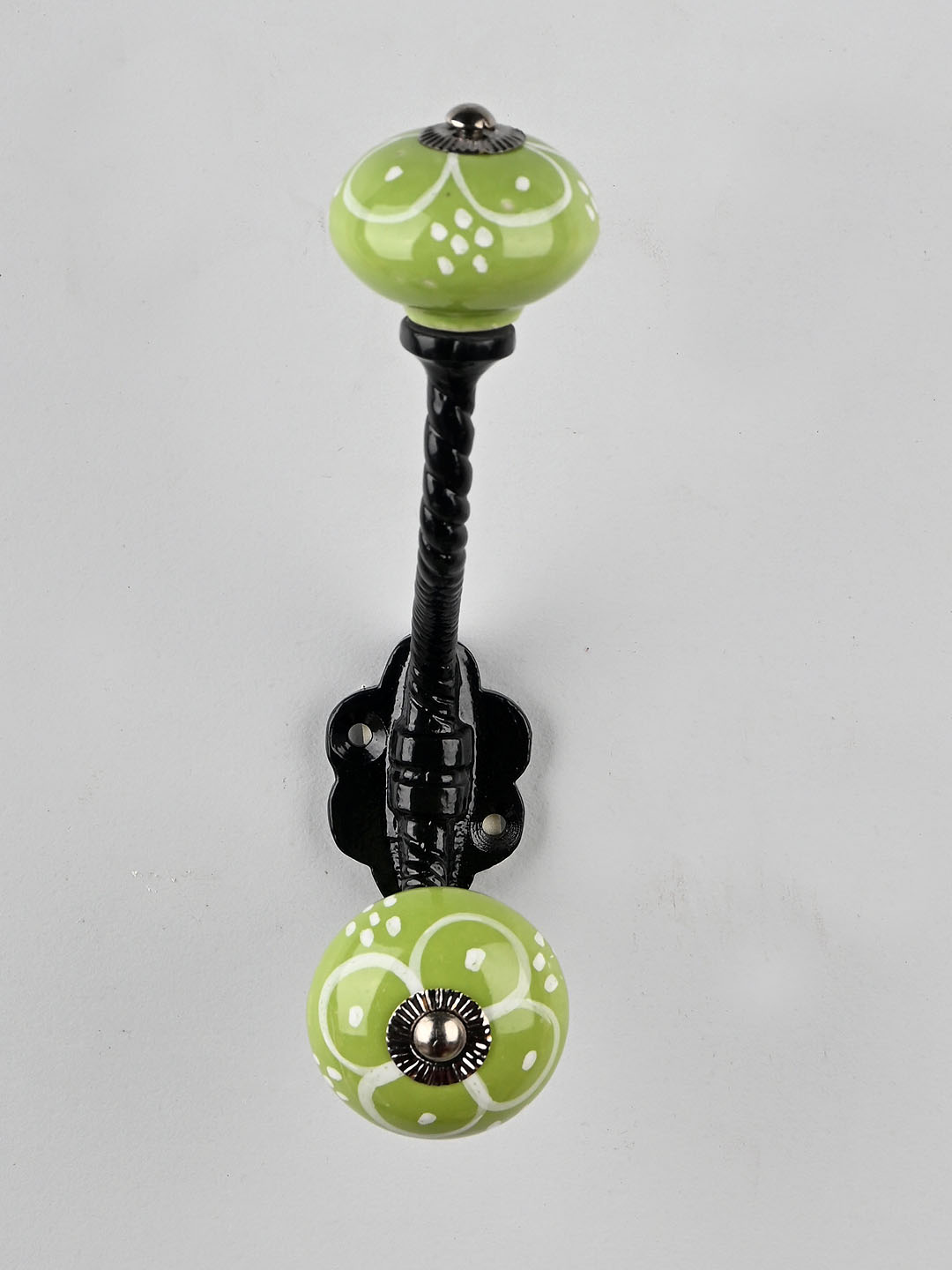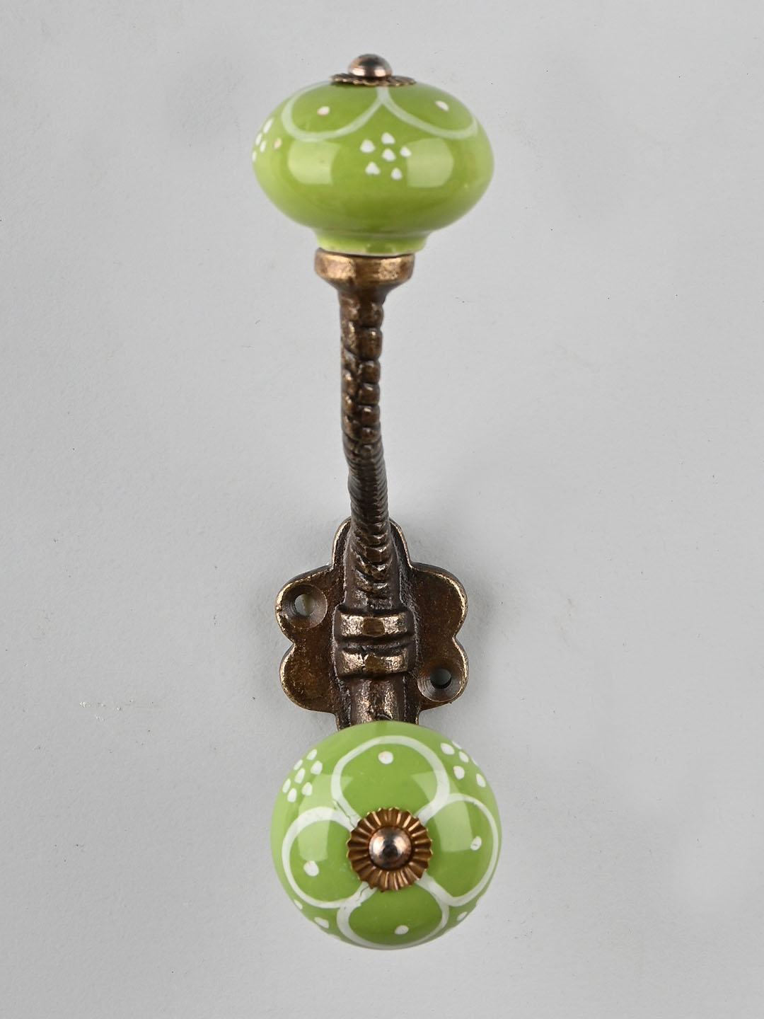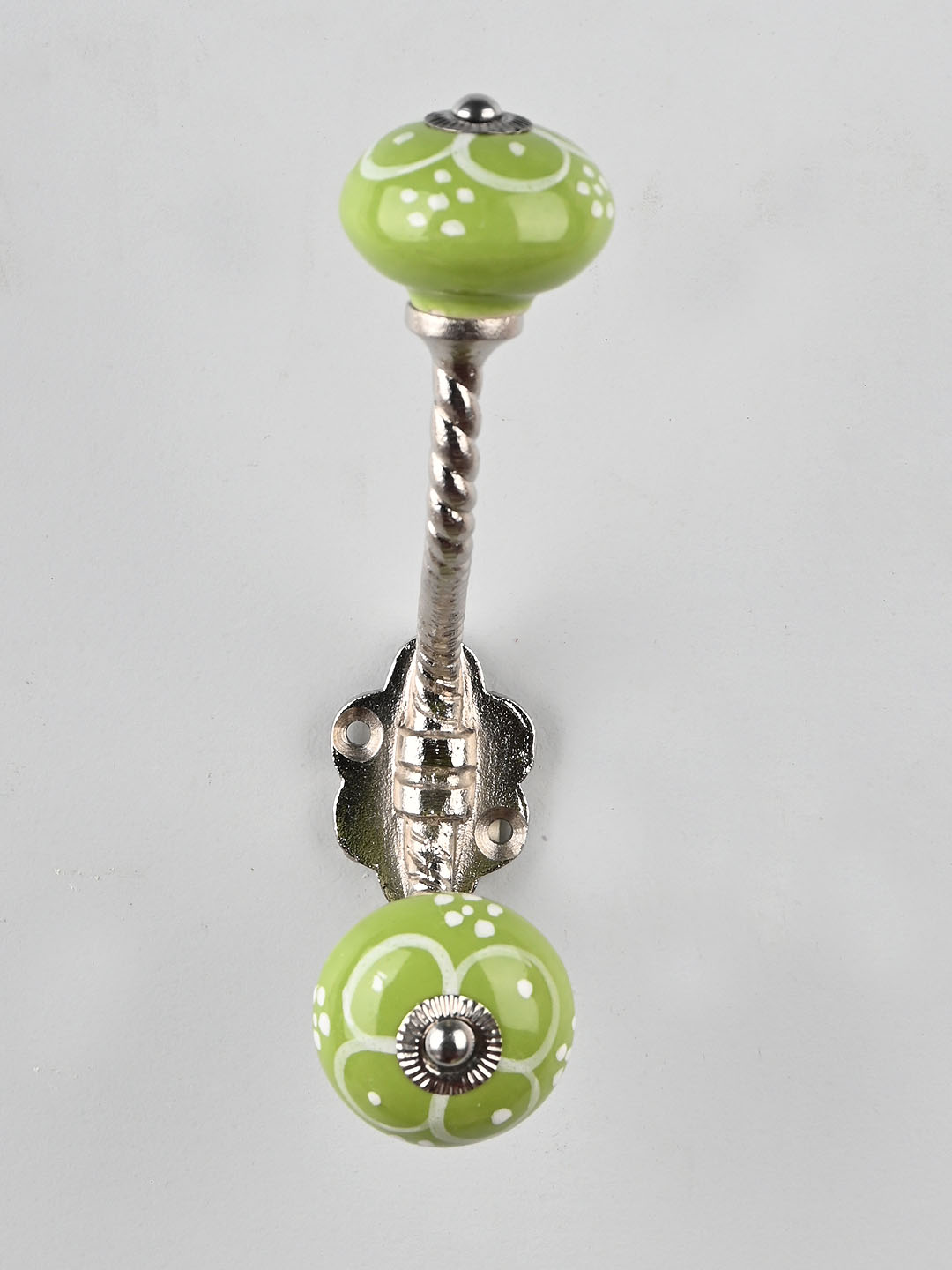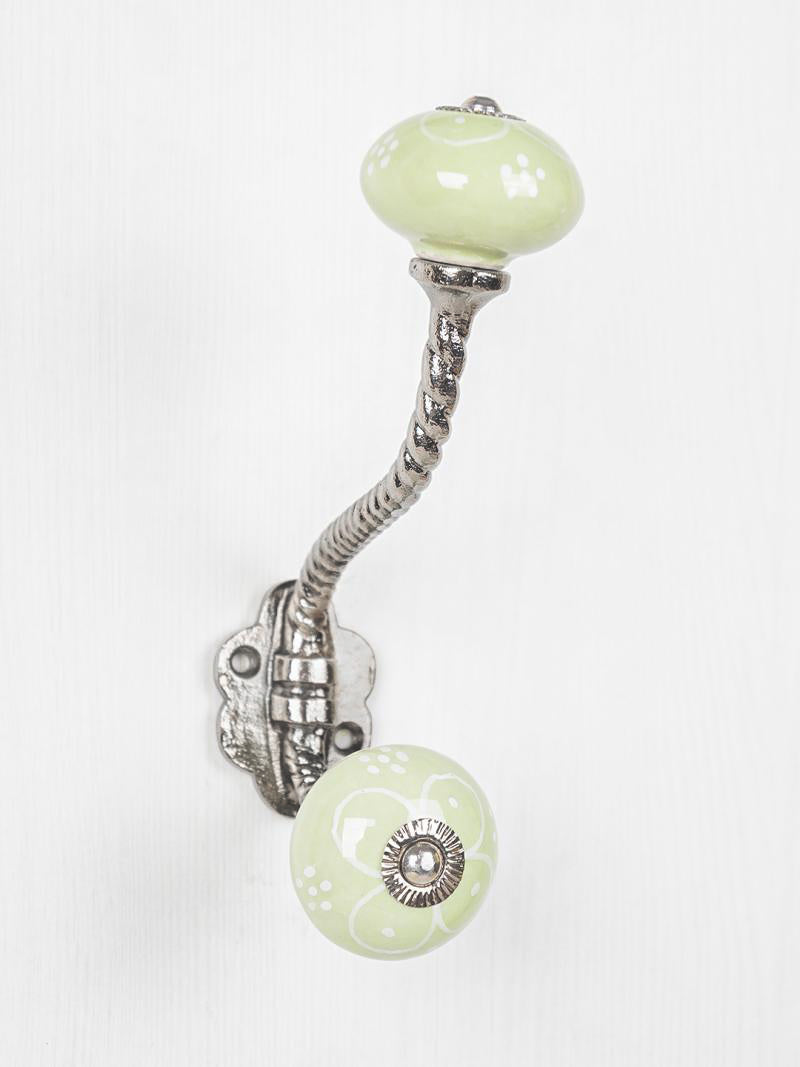 White Flower Design on Green Base Knob With Metal Wall Hanger
