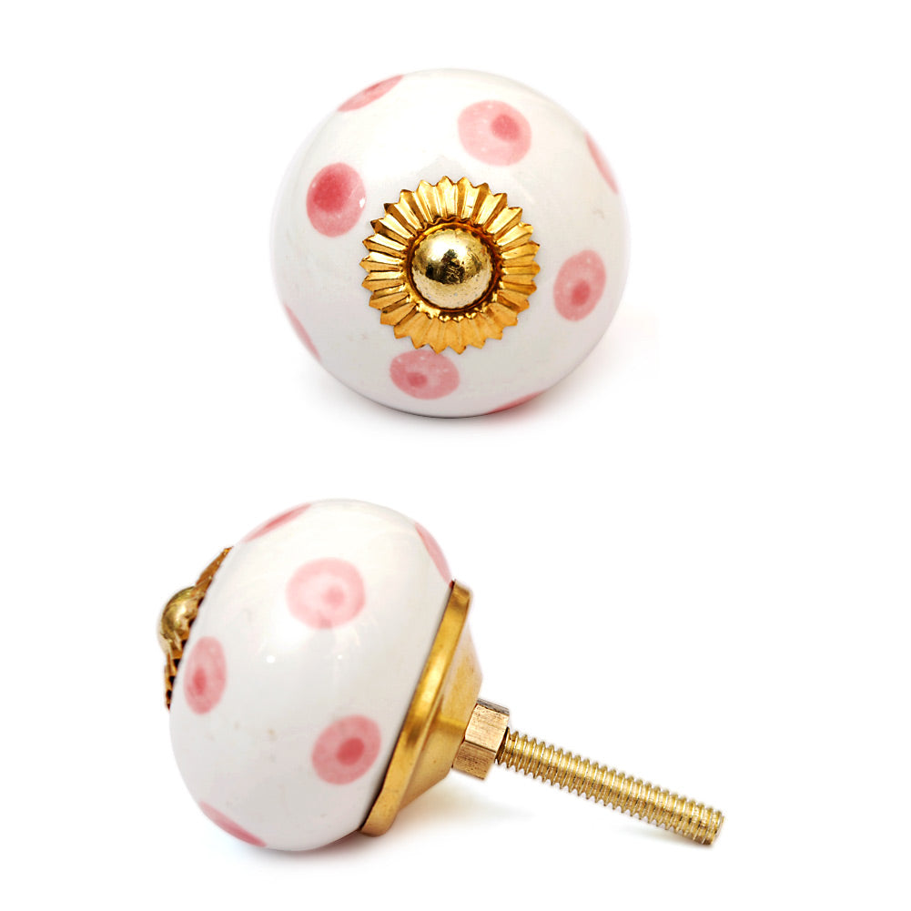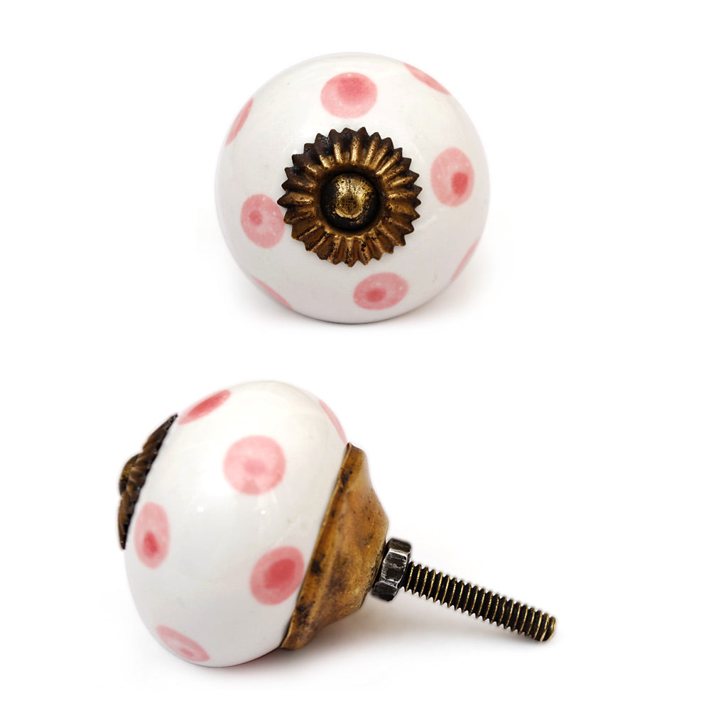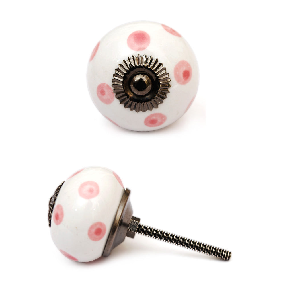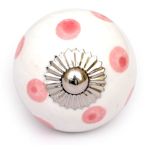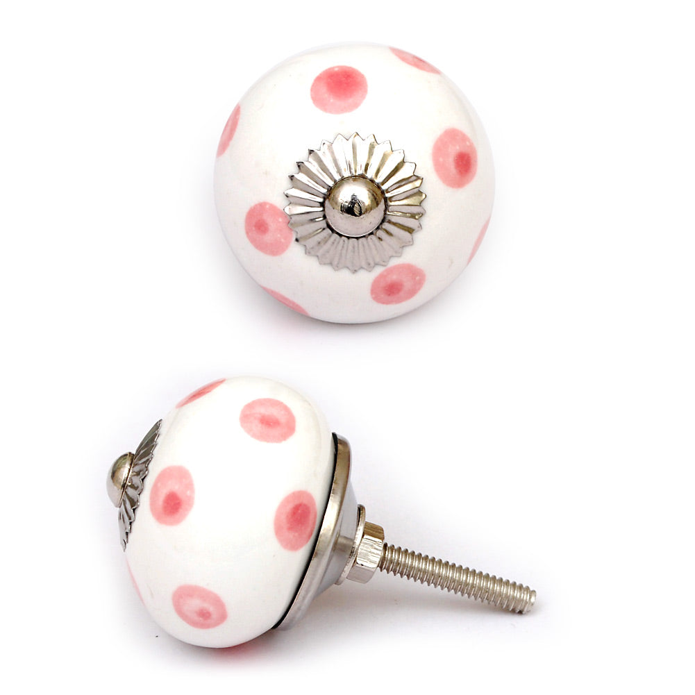 White Round Ceramic Drawer Knob With Pink Polka Dots