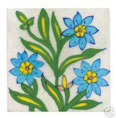 White tile with light blue flowers and green-yellow leaves (4x4-bpt14)