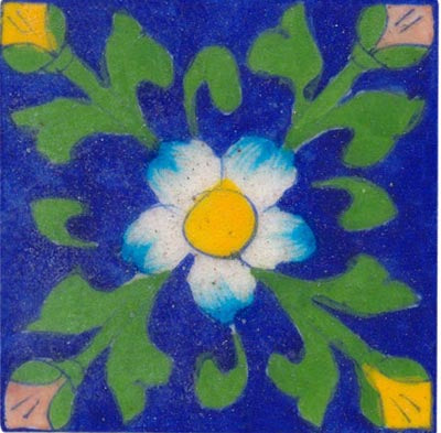 white &turquoise flower with green leaves on blue tile 3x3
