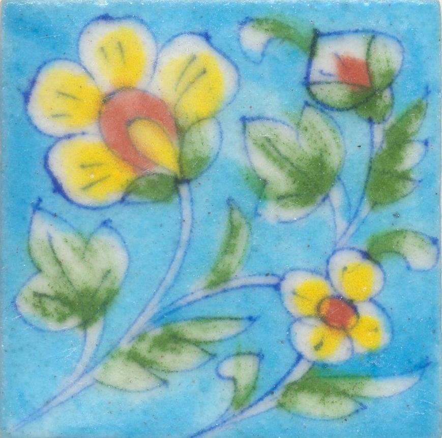 Yellow and Brown Flower and Lime Green leaf with Turquoise Base Tile