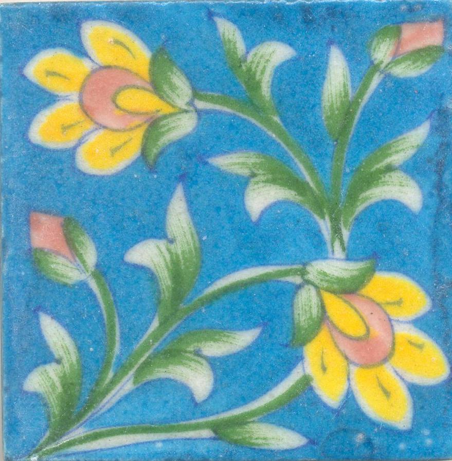 Yellow and Brown Flowers and Green leaf with Turquoise Base Tiles . Unique, hand painted tiles for your kitchen or other tiling project. Tile is 3x3" in size. Delivery time is normally 5 to 7 business days. If the item is out of stock, production and delivery will take 2 to 3 weeks.