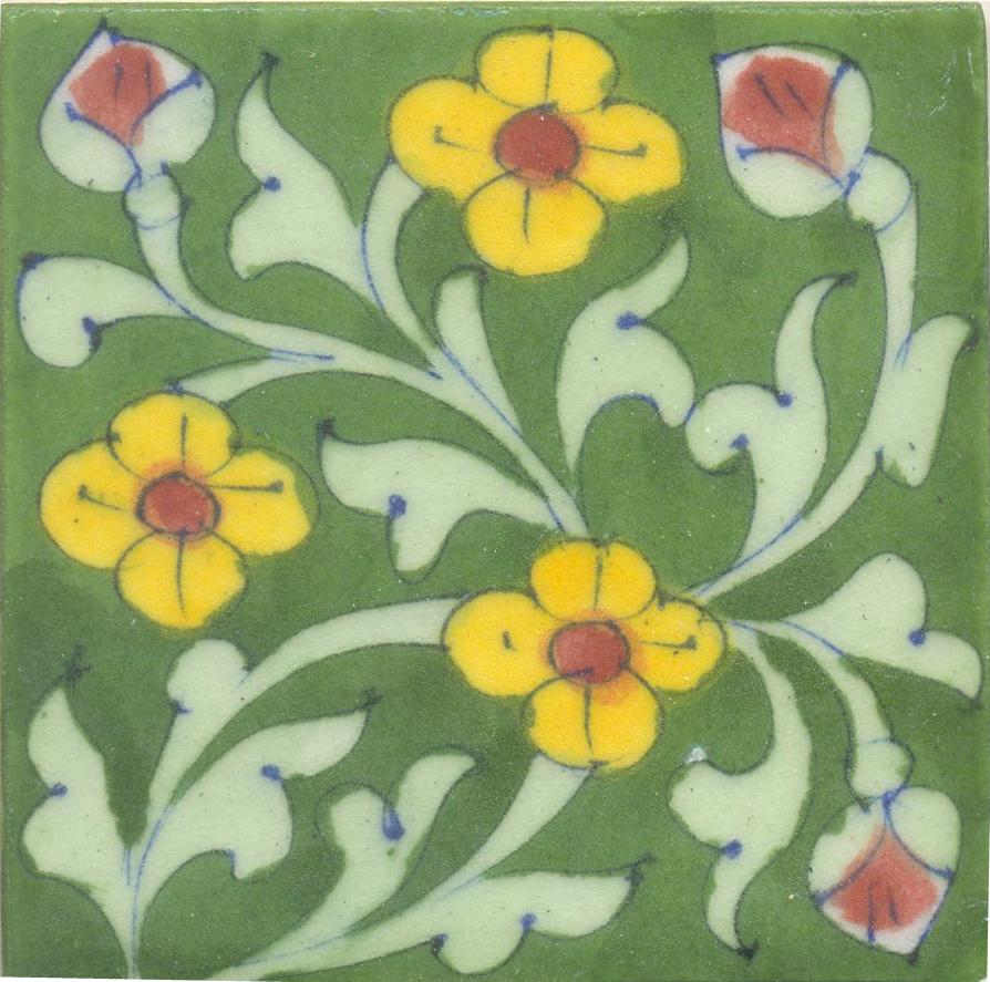Yellow and Brown Flowers and Lime Green leaf with Green Base Tile