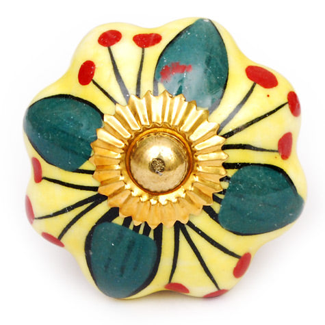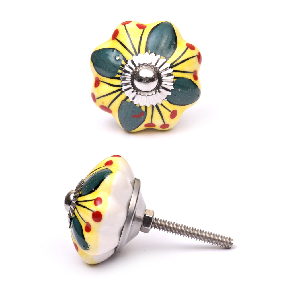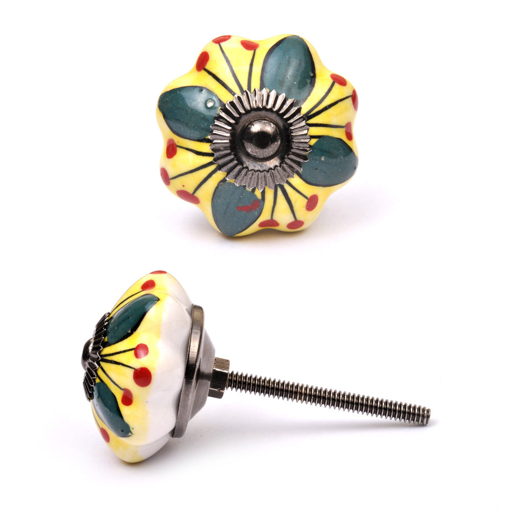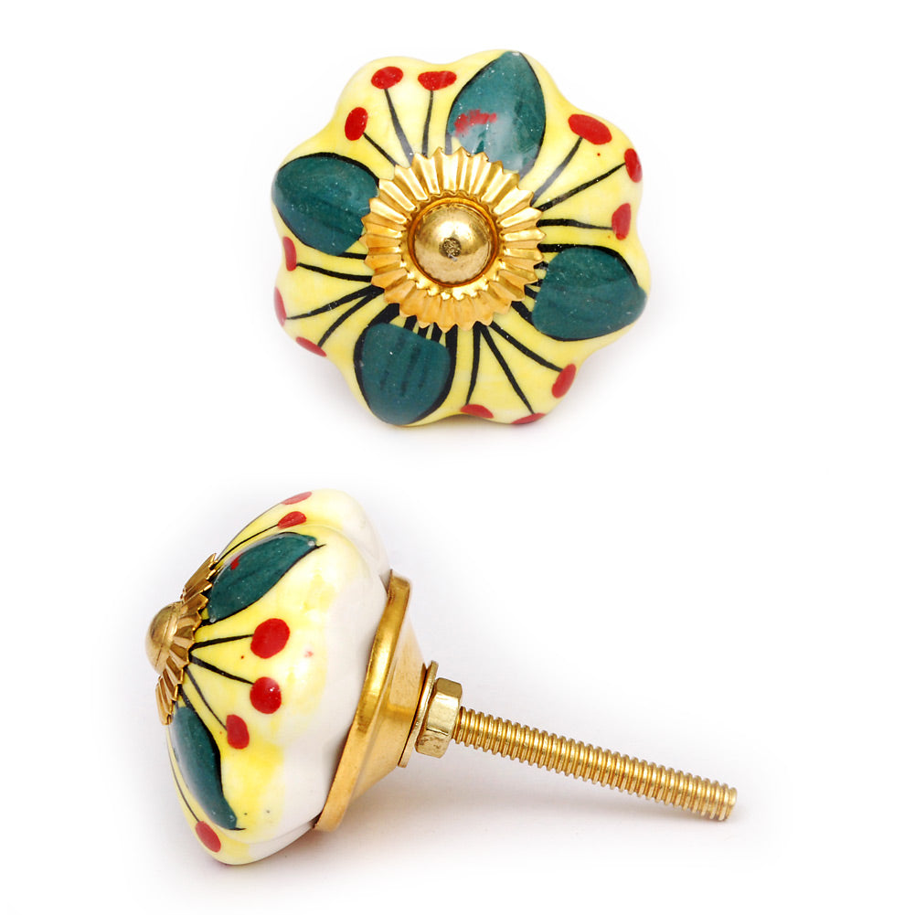 Yellow Ceramic Floral Dresser Cabinet Knob With Green Leaves