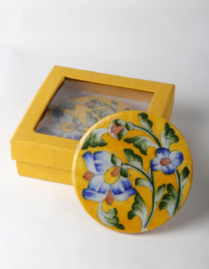 Yellow Coasters with blue flowers and leaves design set of 4 pieces hand painted round tile coaster . Unique, hand painted four piece coaster set for your home or entertaining needs. Each set contains 6 coasters and comes in a gift box. The coasters measure 3.5" in diameter. Delivery time is normally 7 to 10 business days. Click on images below to see additional pictures and size