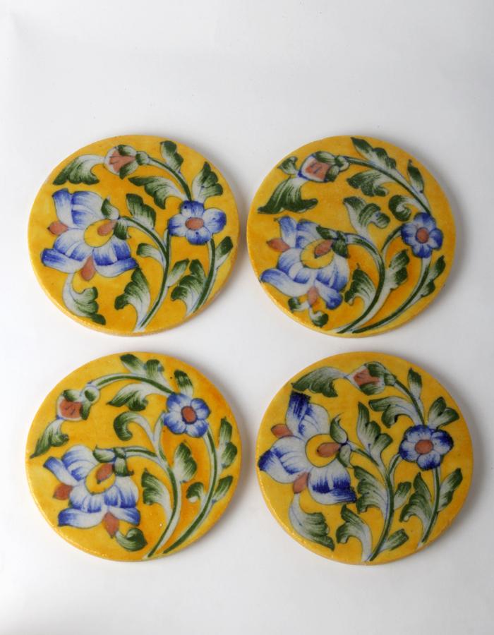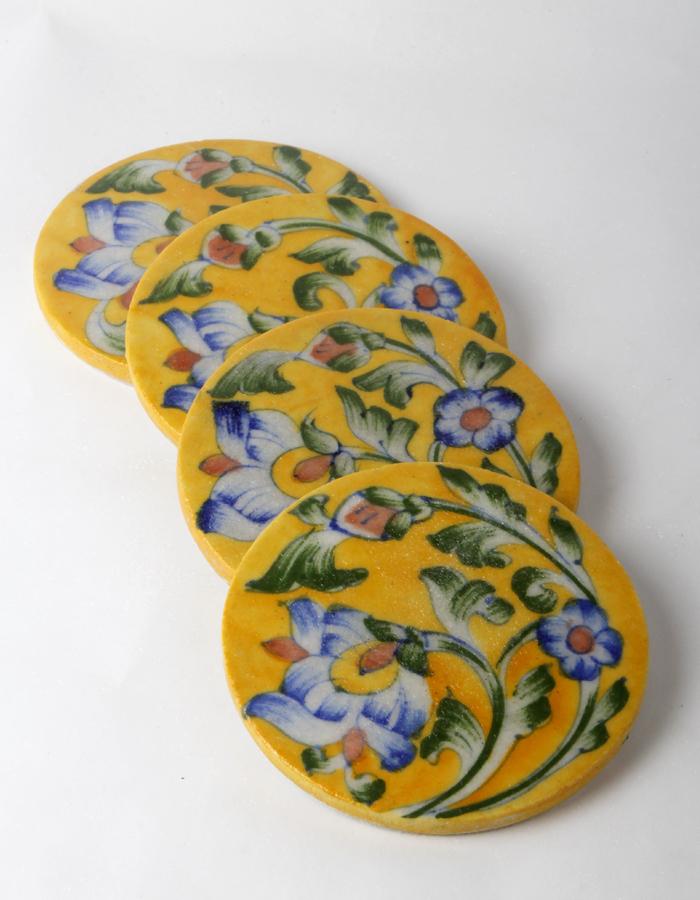 Yellow Coasters with Blue Flowers and Leaves Design( Set of 4 pieces)