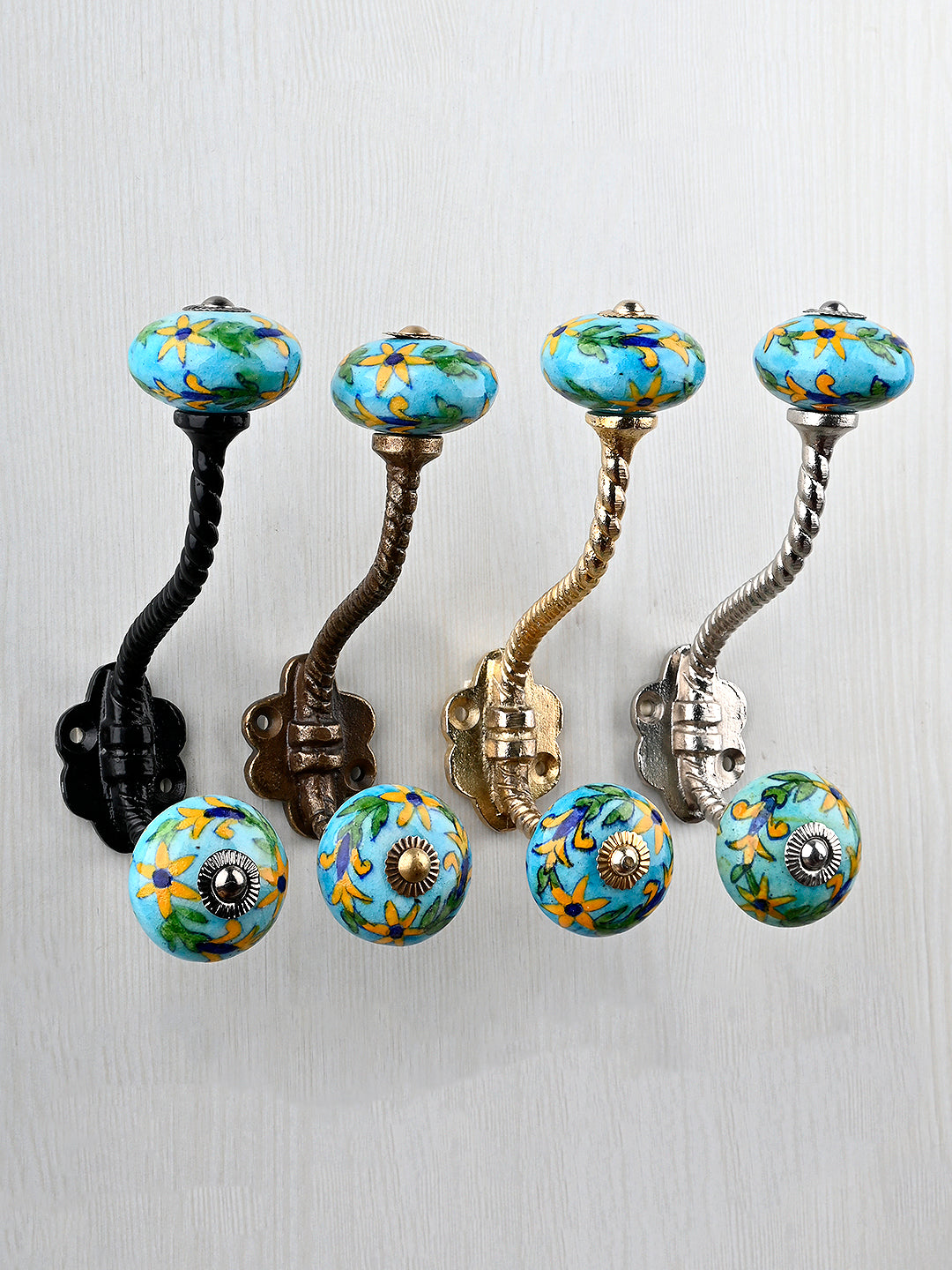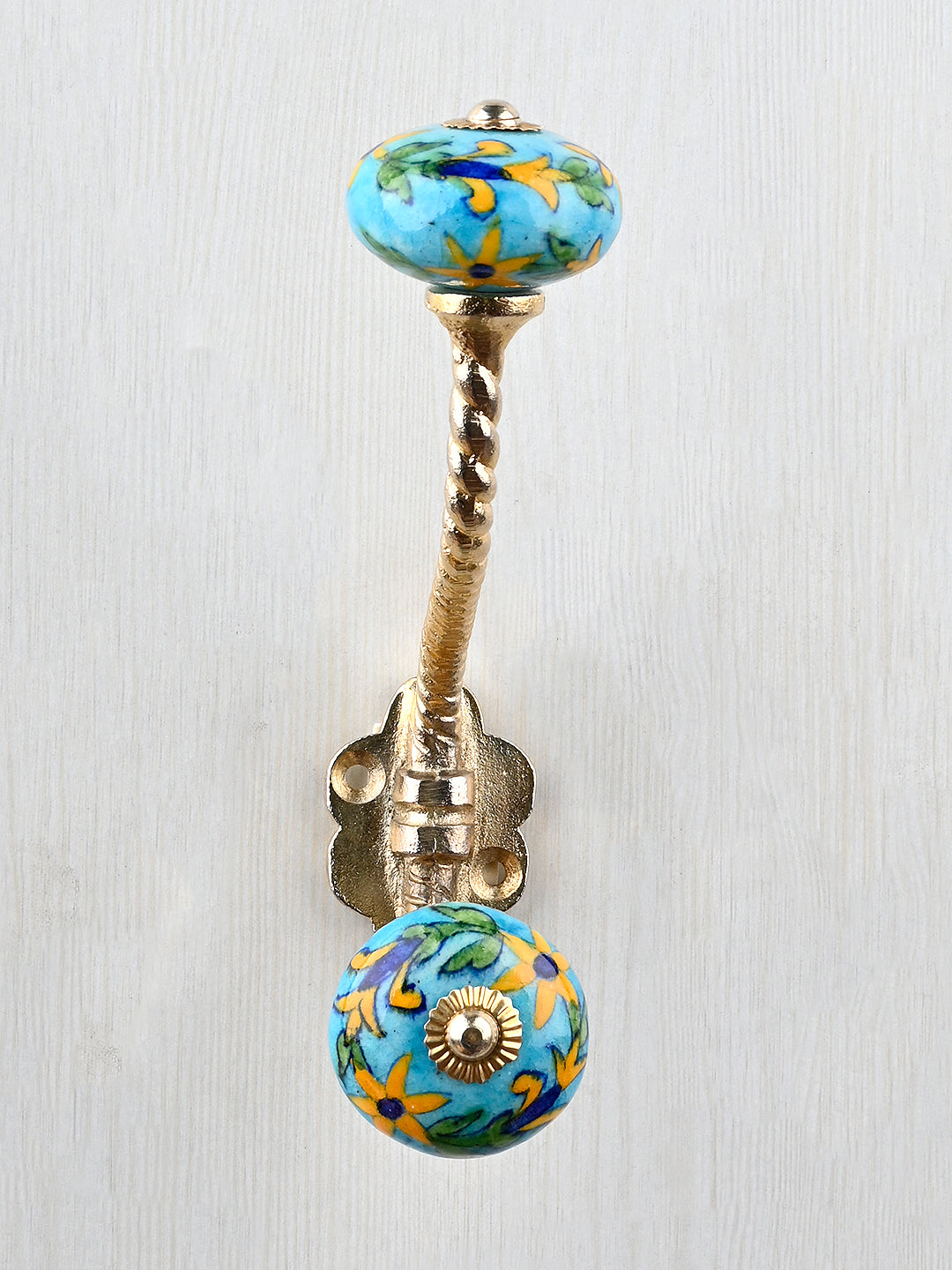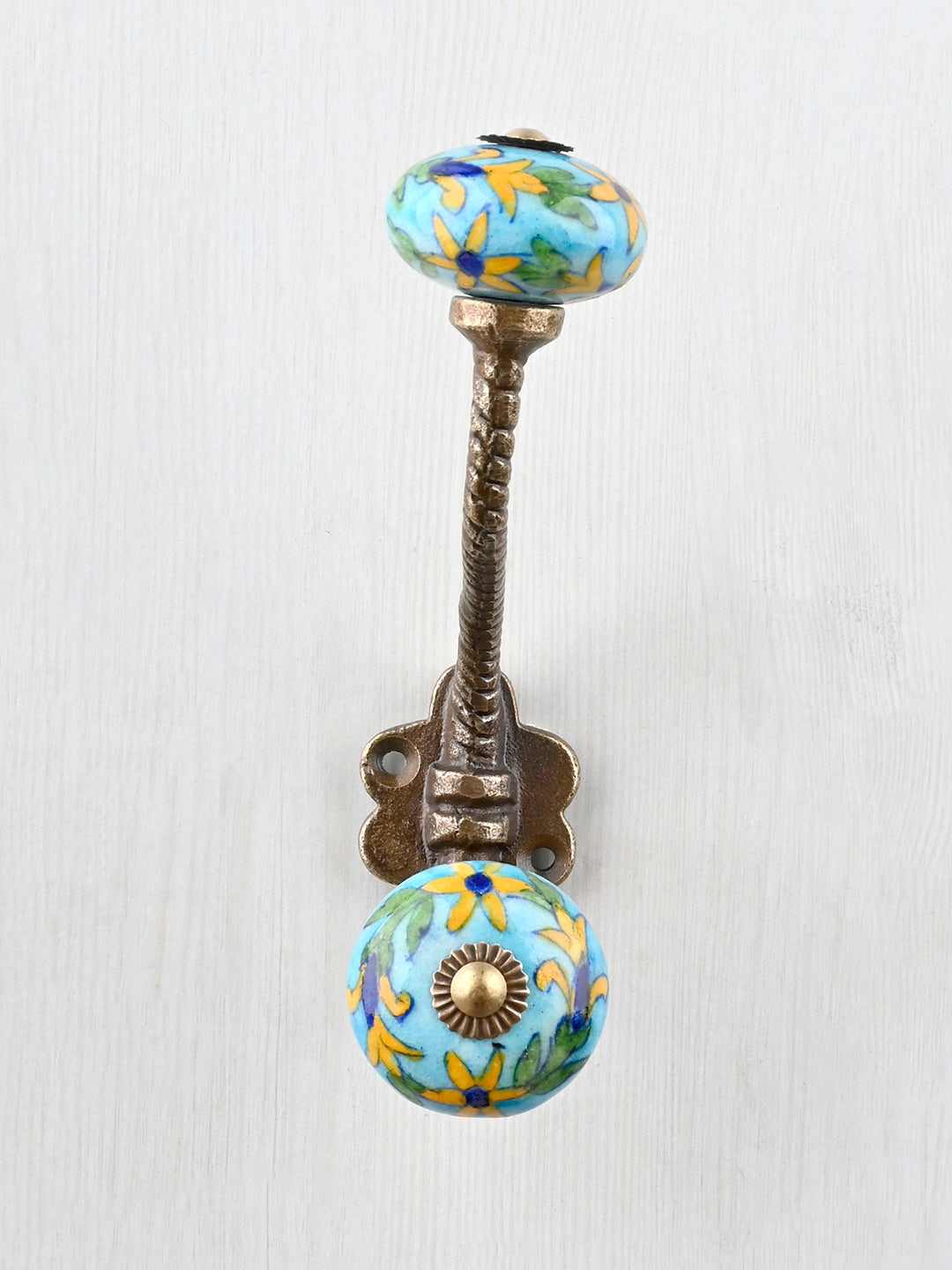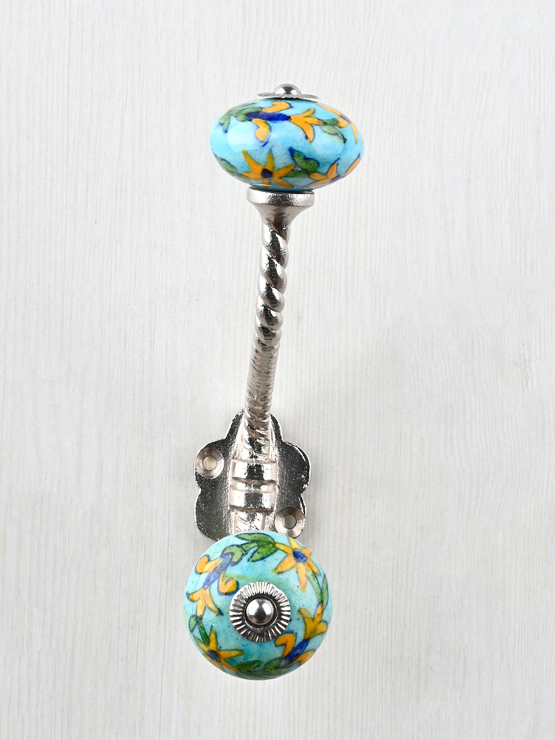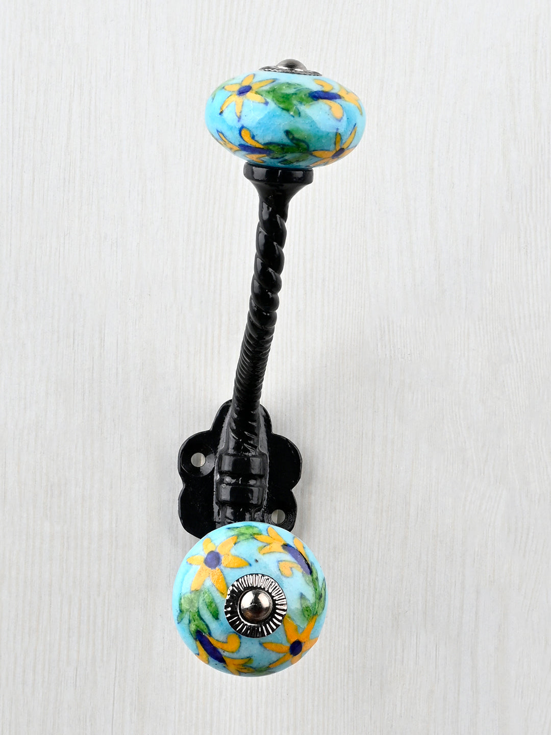 Yellow Flower And Green Leaf Design On Turquoise Knob With Metal Wall Hanger