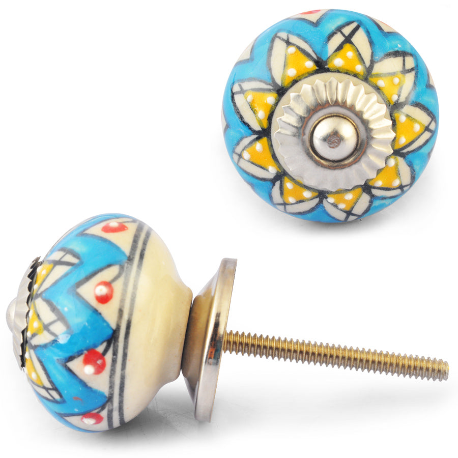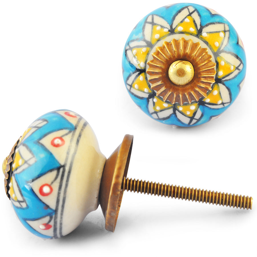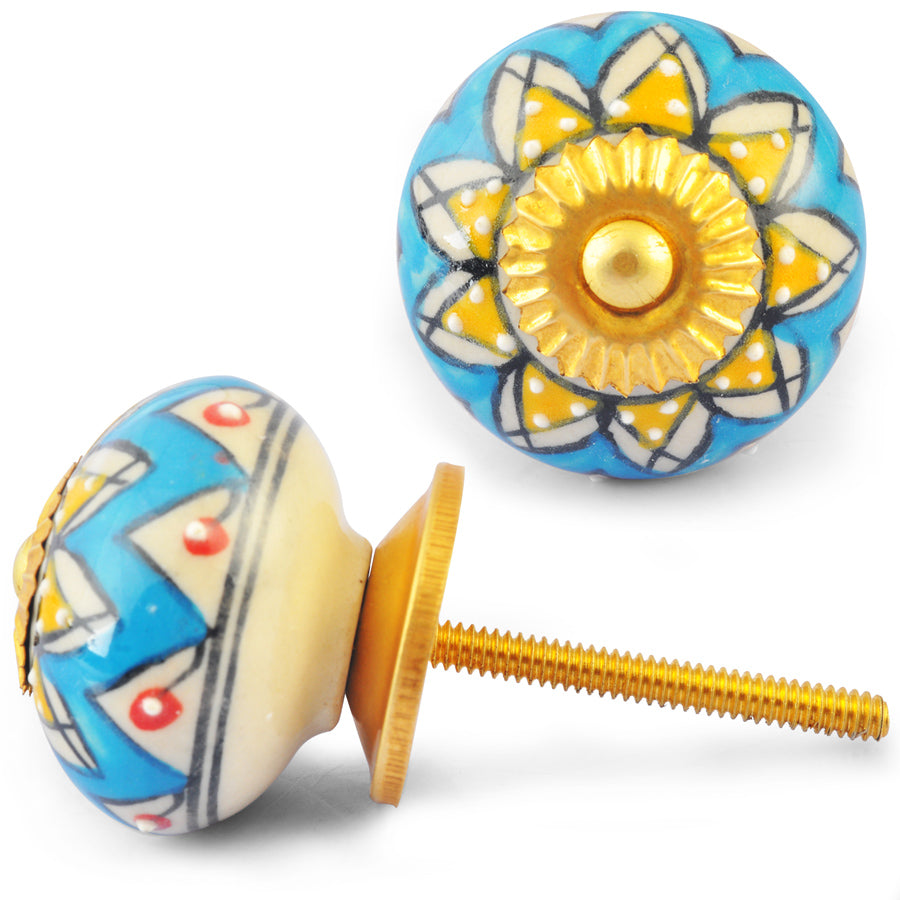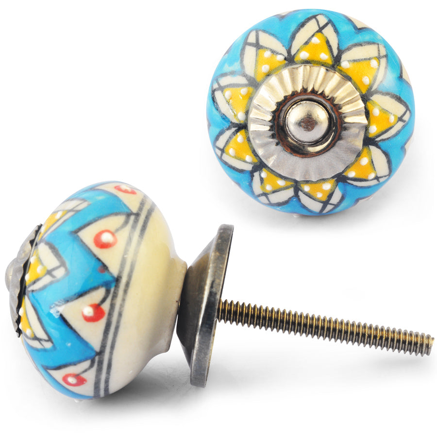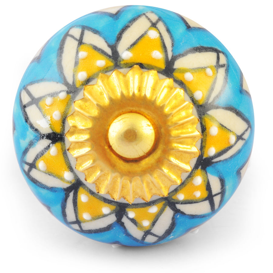 Yellow Flower on Turquoise and White Ceramic knob