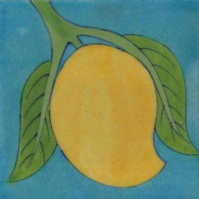 Yellow Mango Green Leaf Design With Turquoise Base Tile