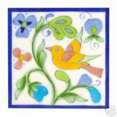 Yellow, pink & green bird with flowers on white tile (4x4-bpt19)