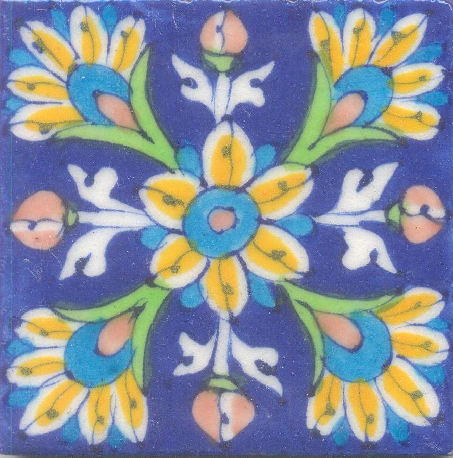 Yellow, turquoise, brown and green flowers on blue tile (3x3-bpt10)