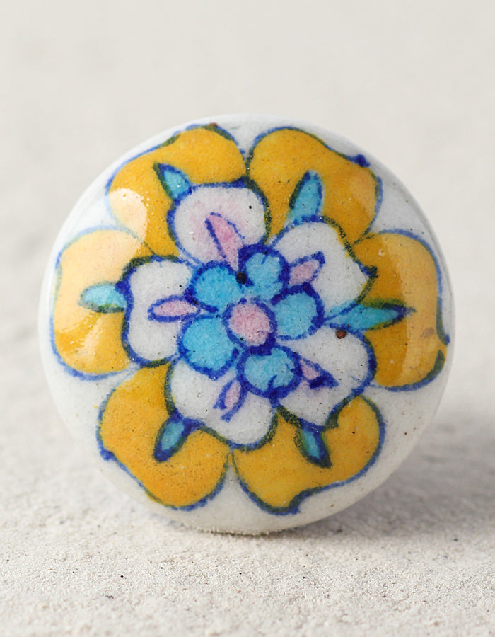 Yellow, White, Turquoise and Pink Flower on White and Blue Knob